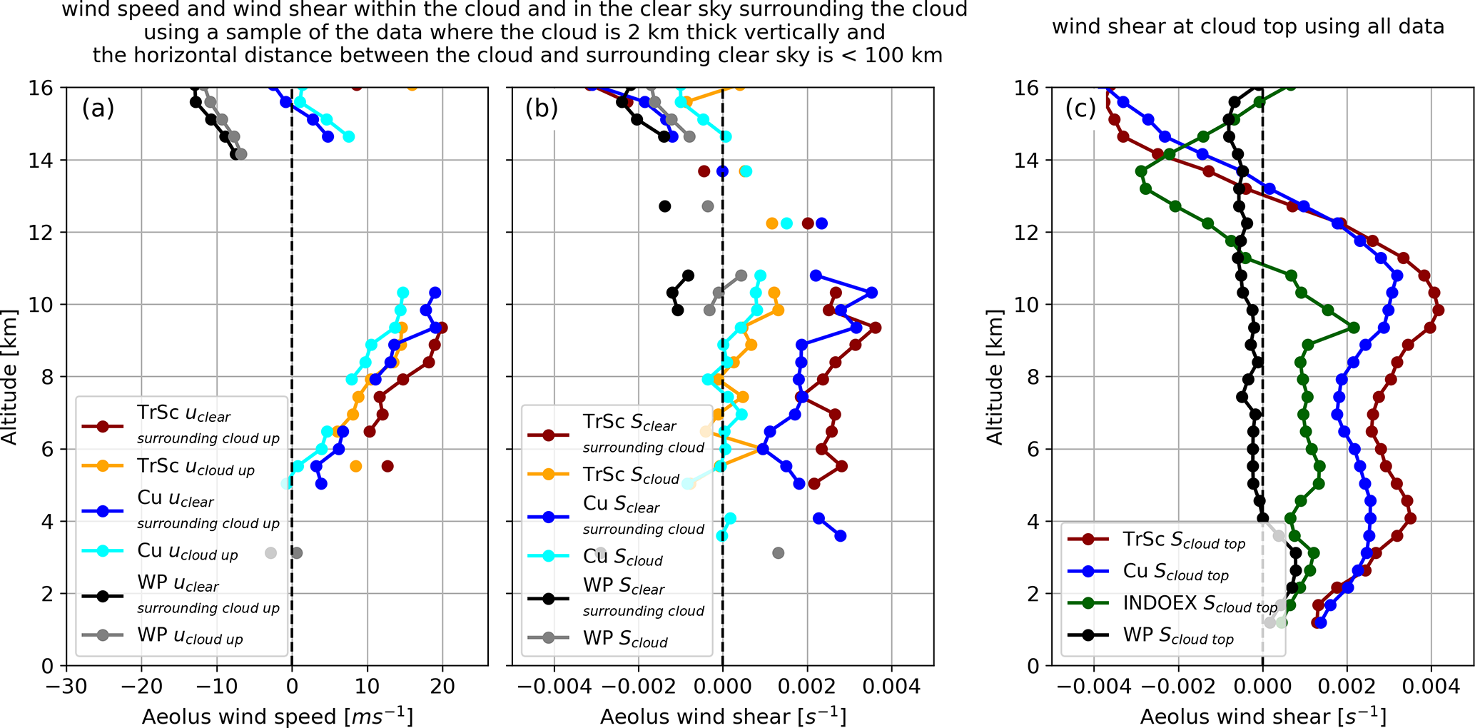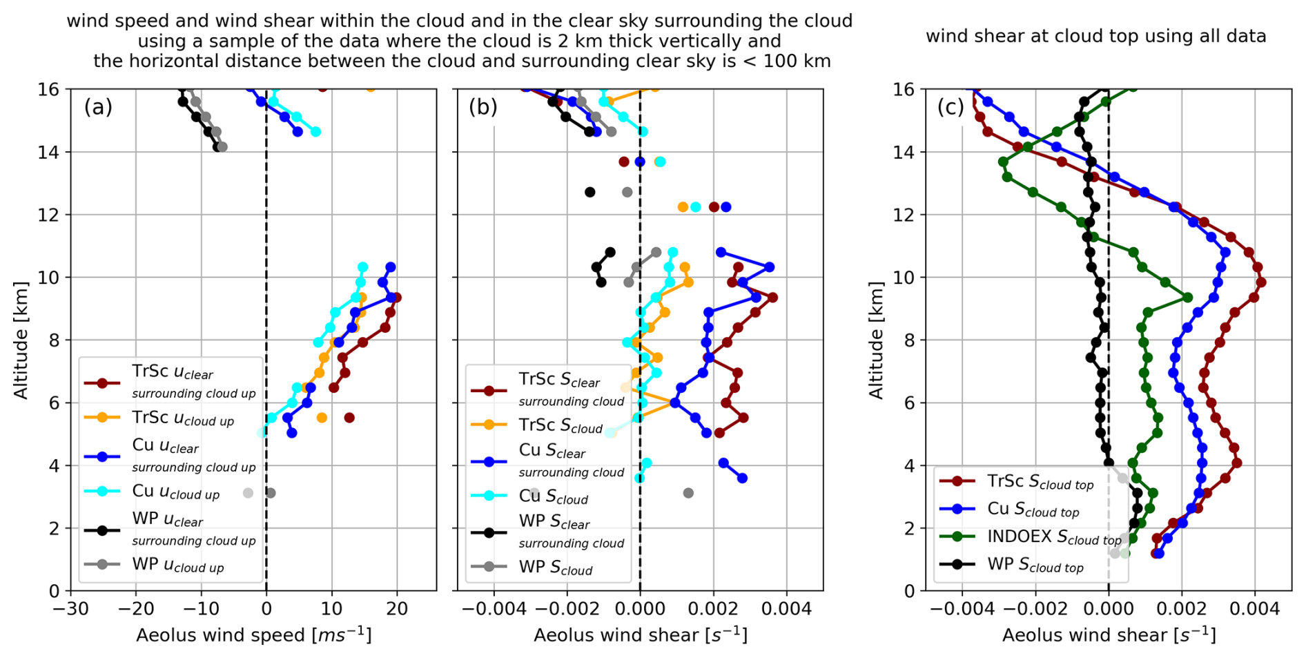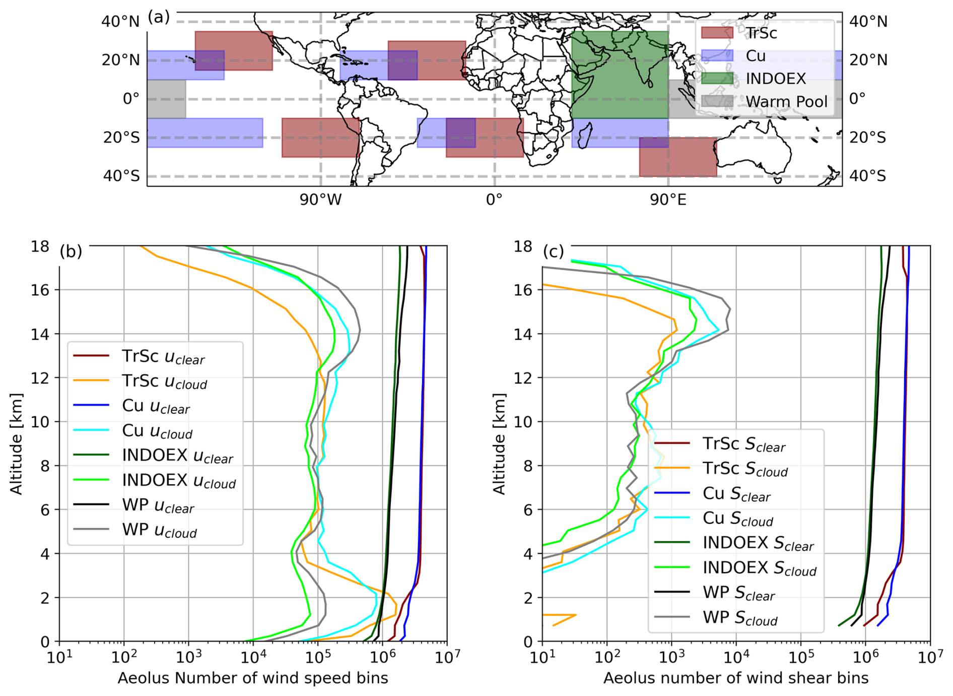 Secondly, we observed wind-cloud interactions at cloud scale (between 3–100 km) in different regions. Over the Indian Ocean as well as over cumulus and stratocumulus dominated regions, we found that the wind shear inside clouds is smaller than the wind shear in the clear sky surrounding the clouds (statistically significant). In addition, we found that the wind speed difference between the cloud and its surrounding clear sky increases with the clear sky wind shear, especially in cumulus () and stratocumulus () dominated regions. This study demonstrated that despite its coarse resolution, Aeolus can capture wind perturbations induced by convective motion.