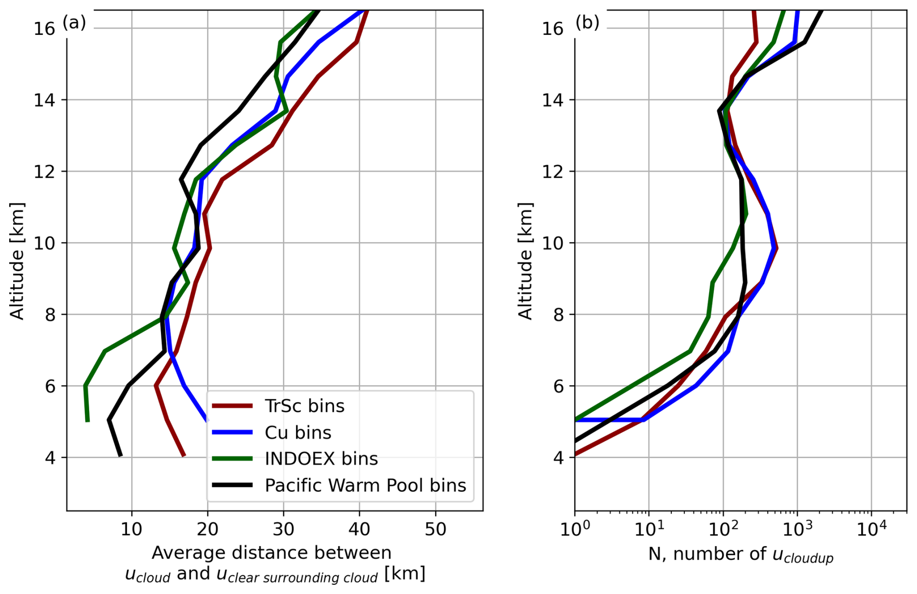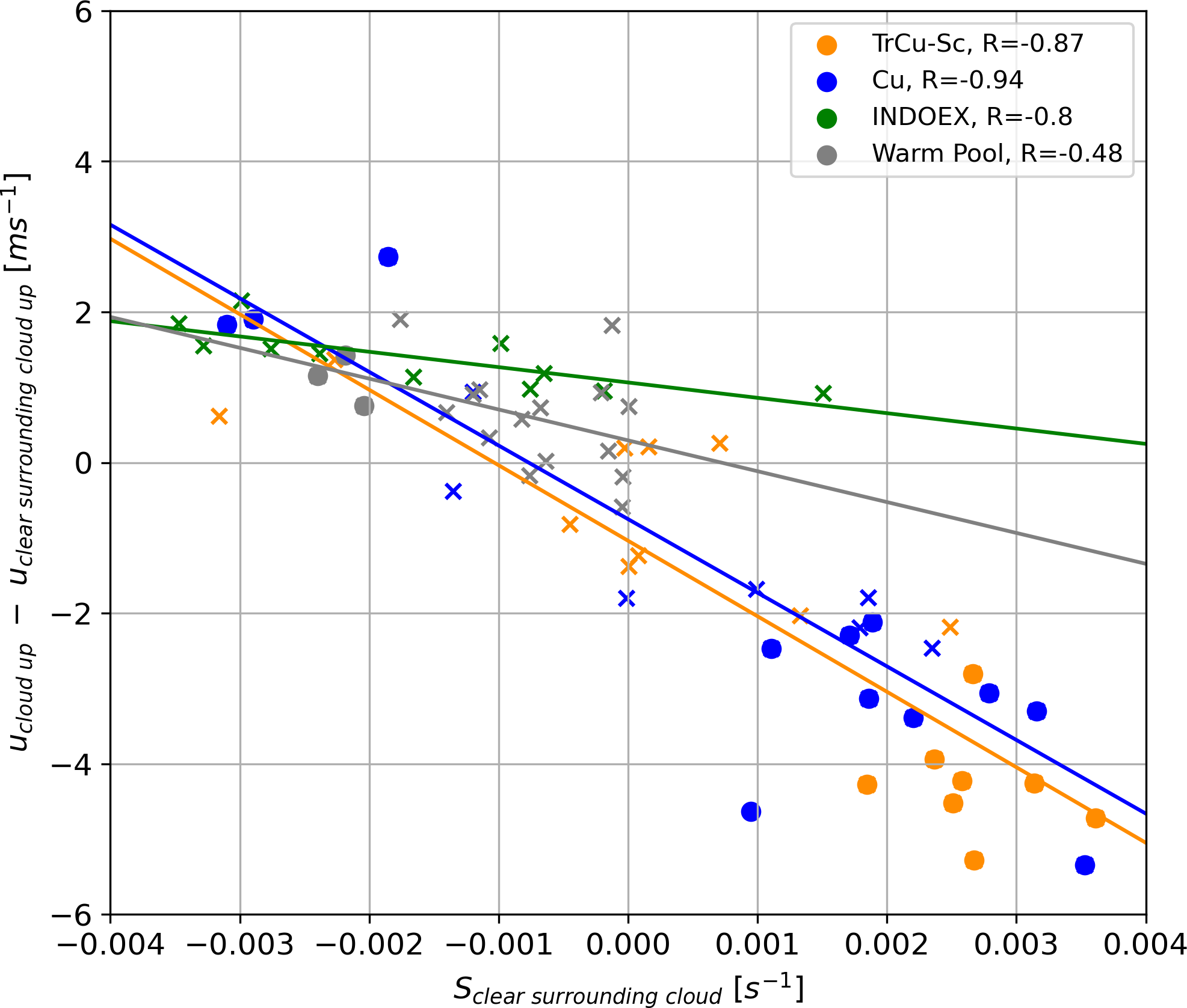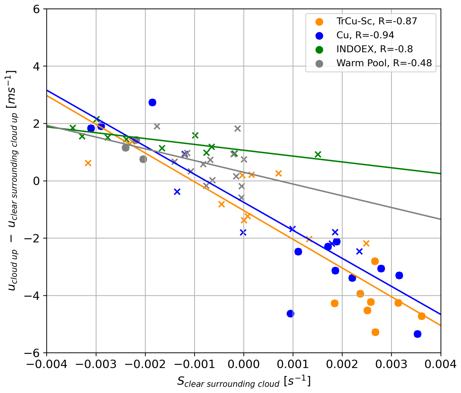 Secondly, we observed wind-cloud interactions at cloud scale (between 3–100 km) in different regions. Over the Indian Ocean as well as over cumulus and stratocumulus dominated regions, we found that the wind shear inside clouds is smaller than the wind shear in the clear sky surrounding the clouds (statistically significant). In addition, we found that the wind speed difference between the cloud and its surrounding clear sky increases with the clear sky wind shear, especially in cumulus () and stratocumulus () dominated regions. This study demonstrated that despite its coarse resolution, Aeolus can capture wind perturbations induced by convective motion.