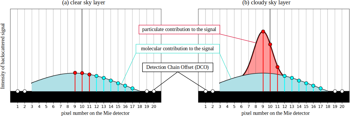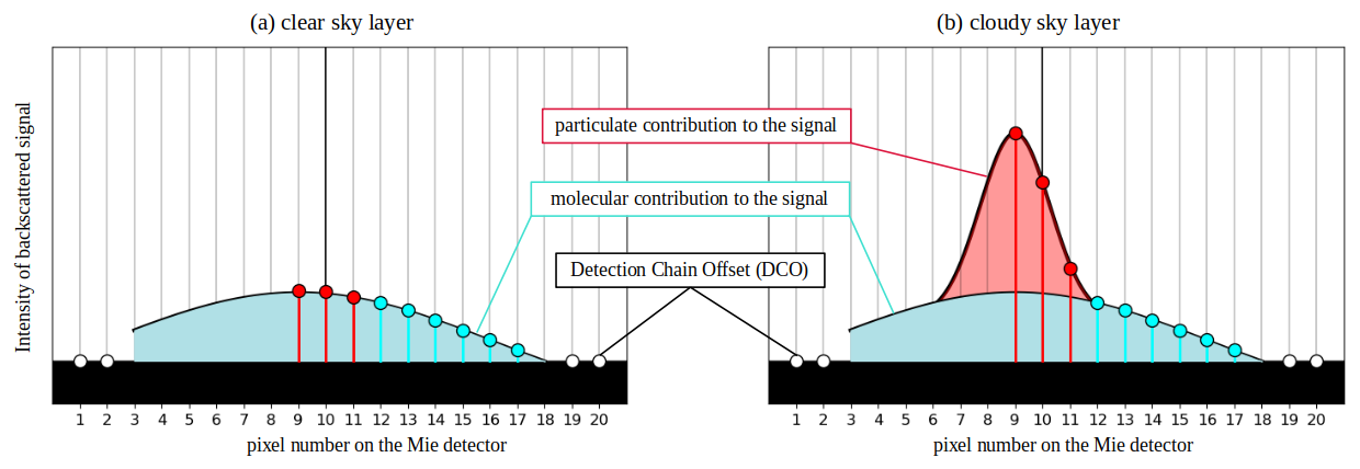 For each profile and each altitude level, we subtracted the Detection Chain Offset (DCO, more details are given in Fig. A1), the solar background, and compensated for the non-uniform intensity distribution on the Mie spectrometer following Donovan et al. (2024). Future work could include cross-talk correction. Then, based on the peak position, we selected eight pixels either to its left or right. The signal retrieved in the pixels corresponding to the peak and the two following pixels are summed and correspond to the particulate backscatter, called Ipart(zL1A) here after, zL1A being the altitude of the centre of a layer in a L1A profile. The signals retrieved in the six remaining pixels are summed and correspond to the molecular backscatter, called Imol(zL1A). Although the molecular or Rayleigh signal in this approach does not represent the actual molecular backscatter, it is proportional to it, enabling us to use the difference between Ipart(zL1A) and Imol(zL1A) to determine the cloud mask.