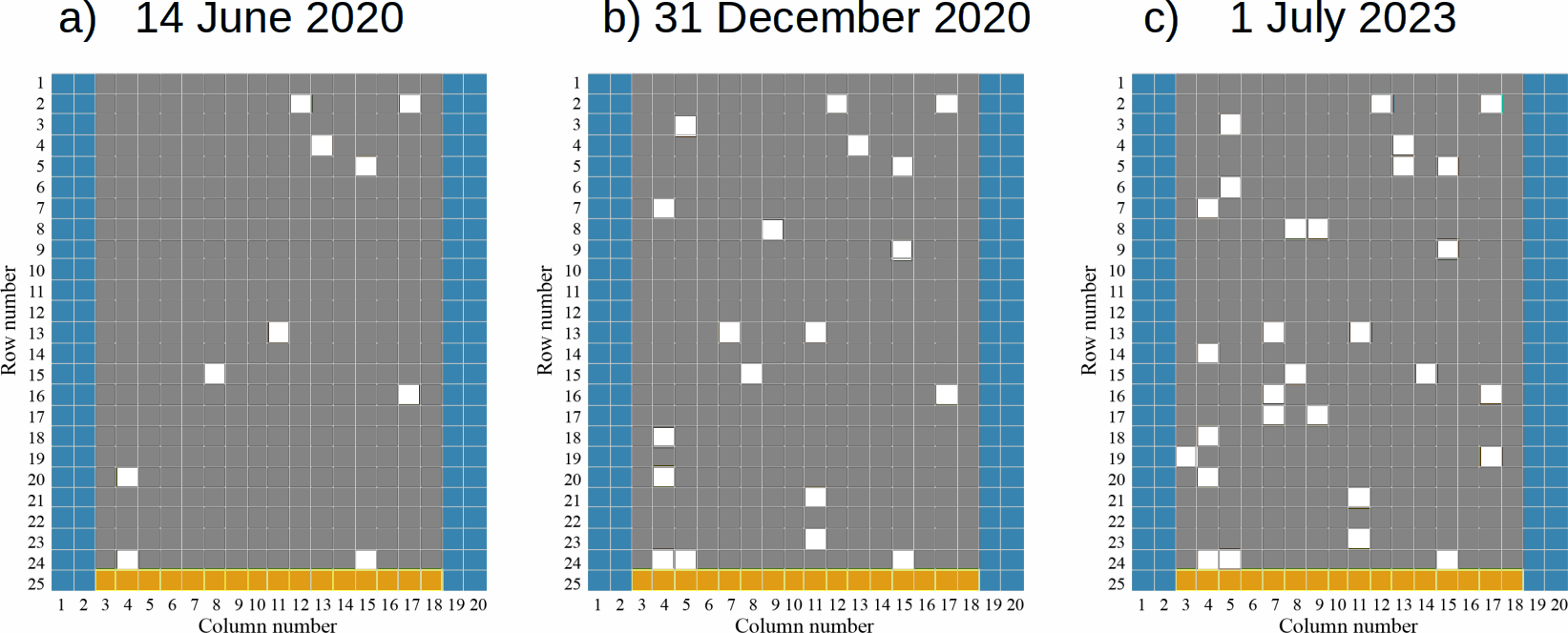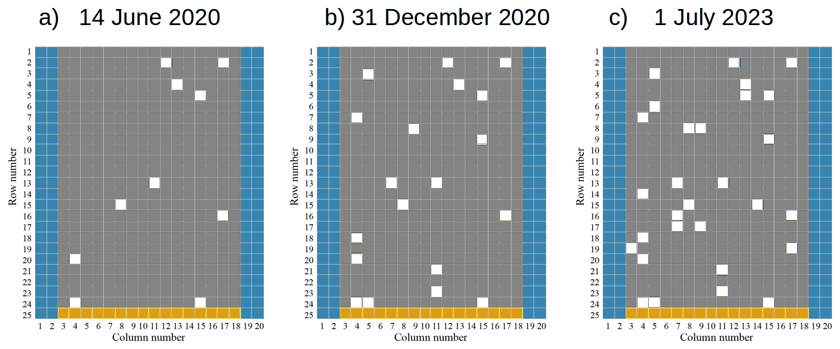 It has been known since the early days of the Aeolus mission that certain pixels of the detector are damaged by cosmic particles and that the number of these pixels almost linearly increases over the mission's lifetime (Weiler et al., 2021). We discard the hot pixels following the hot pixel map of the 31 December 2020 (Fig. A2), which corresponds to the end of the period that we considered in our study. Once the hot pixel is discarded, we apply a “sliding fit” approach (Goldberg et al., 2013; Feofilov and Stubenrauch, 2019) adapted to Aeolus (Feofilov, 2021), which considers the theoretical shape of the Mie backscatter spectrum. In this approach, a predefined spectral shape function is systematically shifted across each row of the Mie channel detector to find the optimal fit that minimizes the difference between the observed and theoretical spectral profiles, thereby simultaneously determining the Mie peak center frequency and reconstructing the complete spectral radiance values.