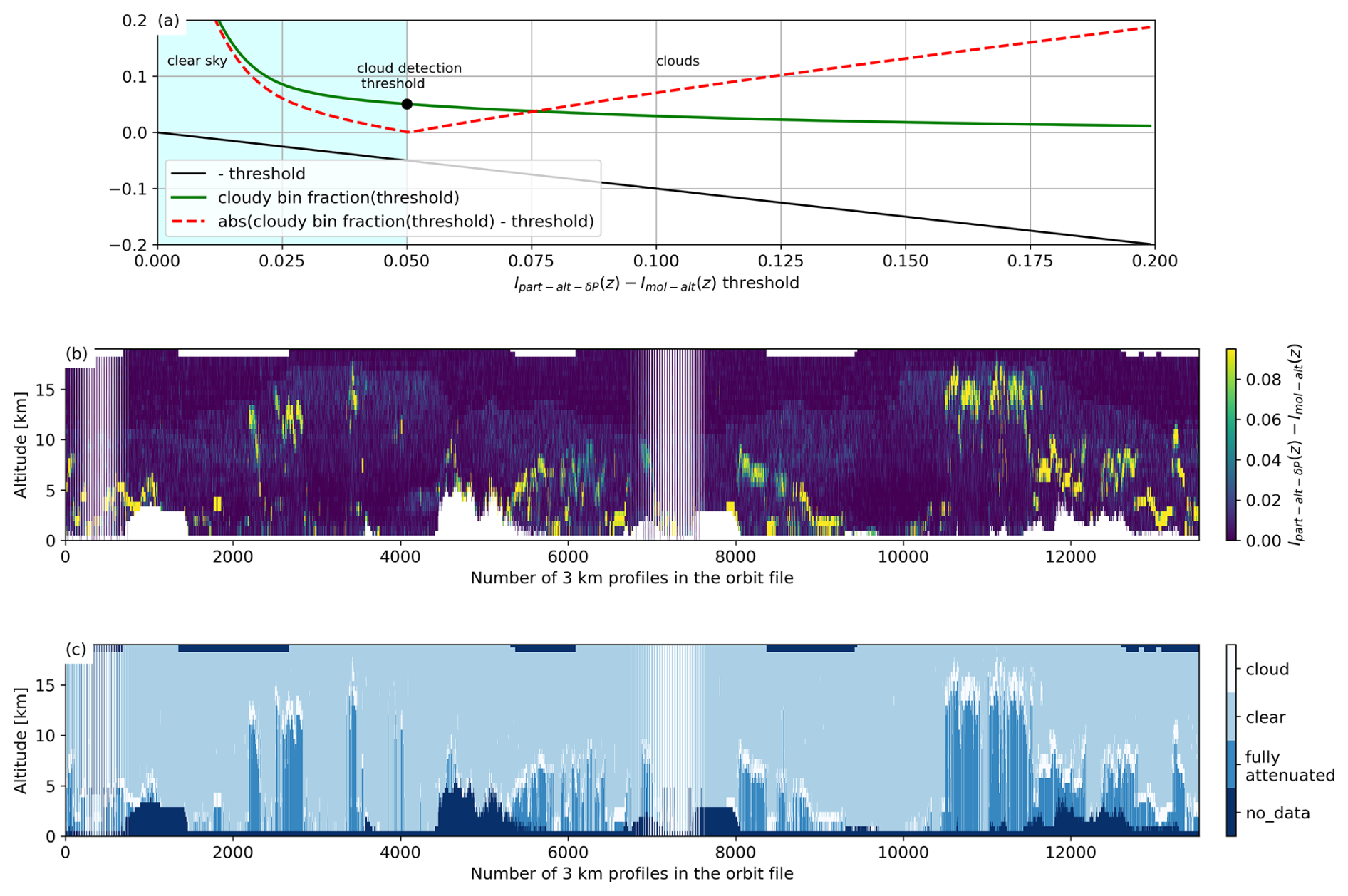 For each profile, a layer is declared cloudy when Ipart-alt-δP(z)−Imol-alt(z) exceeds a certain threshold. Aerosol layers are classified as clear sky. More details about the calculations of the threshold are given in Appendix A and Fig. A3.