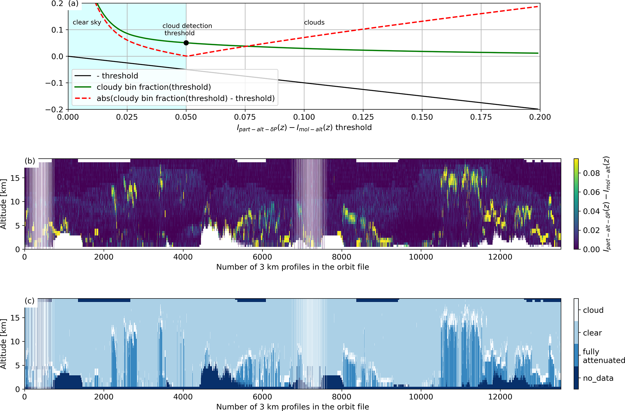 At this stage, the output files are orbit files containing a cloud mask at a 3 km along-track resolution and a 480 m vertical resolution as shown later (Fig. 5b).