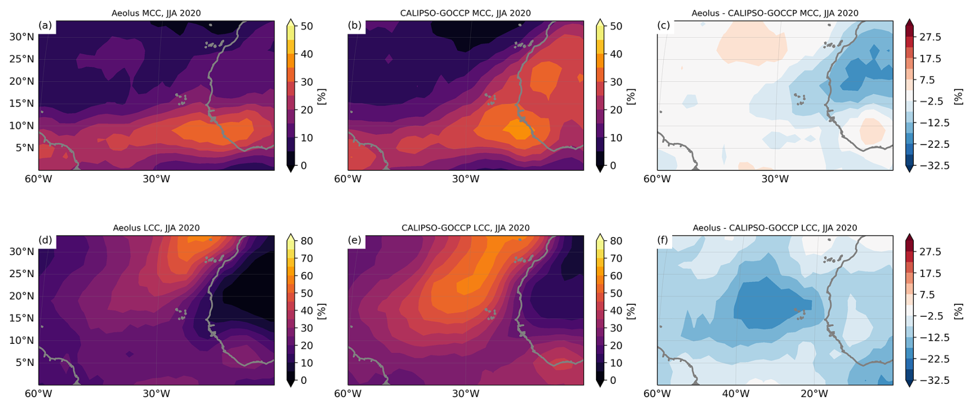 We first observed wind-cloud interactions at regional scale over the Indian Ocean. Aeolus captures the strengthening of the Tropical Easterly Jet in early June 2020, with wind speeds exceeding 40 m s−1 in its core, and a simultaneous increase of high cloud fraction up to above 30 %, until the decay of the jet during fall.