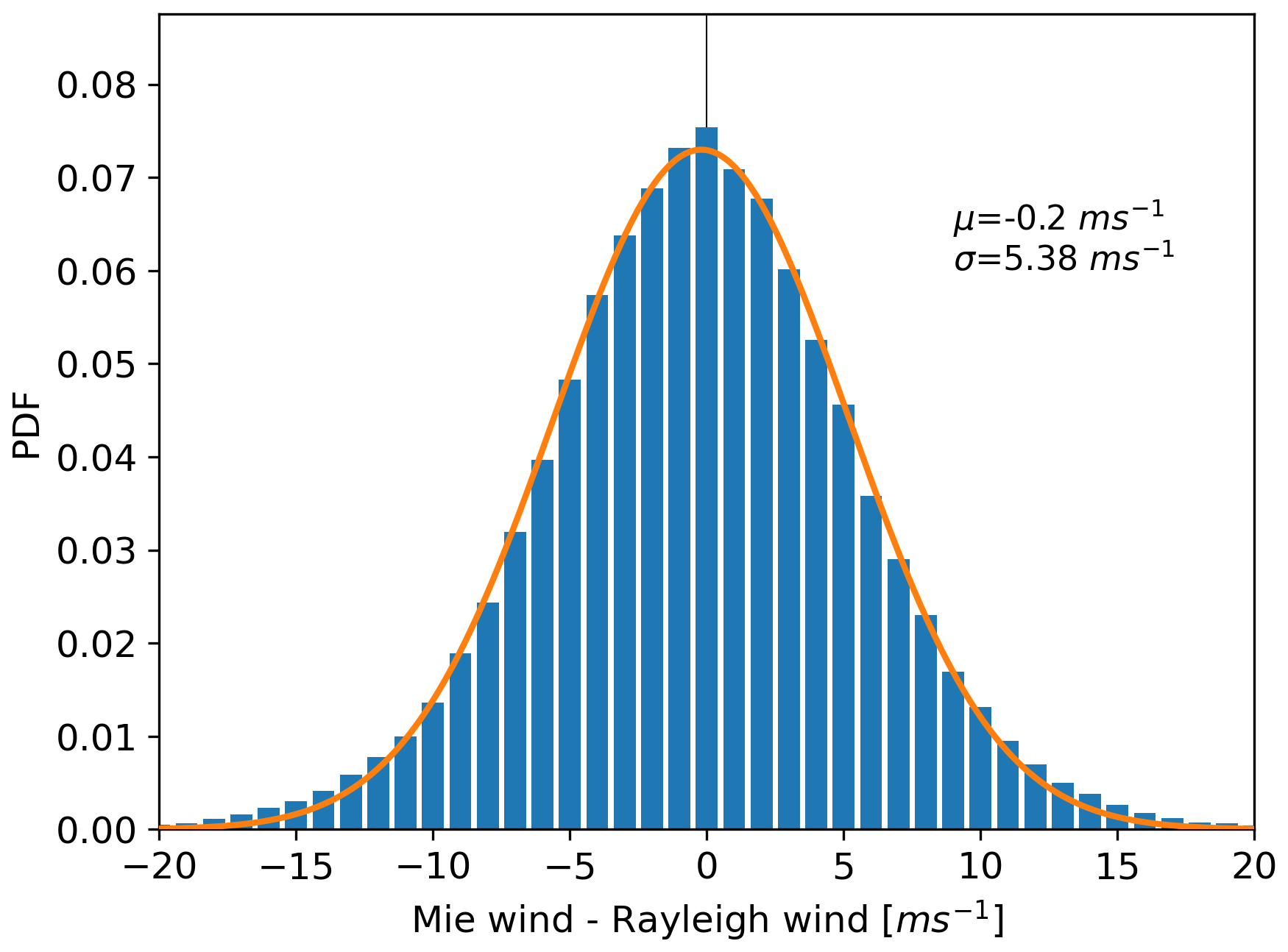The following statistics illustrate how often Rayleigh and Mie winds coexist within and outside the cloud mask. During the period extending from June–August 2020, 83 % of the 3 km×480 m bins flagged as cloudy with our cloud detection contained both a Rayleigh and a Mie wind, while 10 % of bins flagged as cloudy contained only a Mie wind and 7 % only a Rayleigh wind (on the edge of clouds or at cloud tops). On the other hand, 92 % of bins flagged as clear contained only a Rayleigh wind, 7 % contained both a Mie and a Rayleigh wind and 1 % contained a Mie wind only.