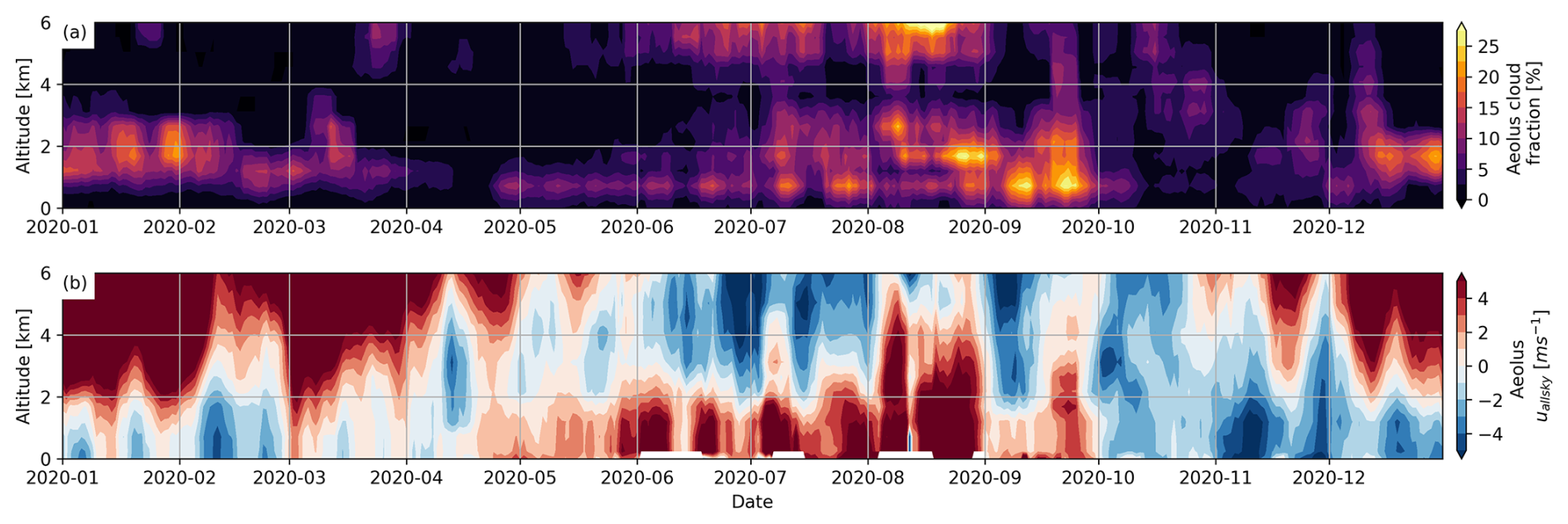 Figure 6 illustrates how Aeolus resampled cloud mask and winds allow us to observe from space different features ranging from cyclones to cumulus clouds. During its lifetime, Aeolus observed multiple cyclones, sometimes crossing them near their centre (Marinescu et al., 2022). Figure 6a shows an example of intersection between Aeolus and the tropical cyclone Paulette over the Atlantic Ocean during the hurricane season, on 12 September 2020. The wind and cloud curtains are displayed between 20 and 40° N (Fig. 6b–g). Note that Aeolus covers this distance in about 4 min, so the curtains represent a snapshot of the scene. The cyclone is identified by the continuous high cloud cover between 26 and 32° N at about 12 km of altitude (Fig. 6b). The laser typically only penetrates 1–2 km below the uppermost cloudy layer of the cyclone. This particular case study is also interesting as it encounters a diversity of clouds. We observe a cirrus cloud, northward of the cyclone, extending from 33–34° N and between 12 and 15 km of altitude. Along half of its length, this cirrus does not fully attenuate the laser as some clear sky layers can be retrieved below its base. We also observe shallow cumulus clouds (Fig. 6a and b) between 20 and 26° N, with their tops below 3 km of altitude and sometimes only occupying a single profile, surrounded by clear sky profiles. This stresses out the importance of performing cloud detection at full horizontal resolution of 3 km. Aeolus retrieves Rayleigh winds above and around the cyclone, up to 18 km of altitude (Fig. 6c). As the horizontal resolution of Rayleigh winds is fixed to 87 km, and molecular signal is still retrieved within clouds, some Rayleigh winds can be retrieved within clouds. For example, there are Rayleigh winds within the upper cloudy layers of the cyclone and in the entire boundary layer, even within shallow cumulus clouds (Fig. 6c). However, we only keep Rayleigh wind values outside of the cloud mask when building uclear (Fig. 6d). The cross section of uclear (Fig. 6d) reveals the wind shear found where counter-clockwise winds around the cyclone base meet the clockwise winds at the top of the cyclone. This happens at about 8 km of altitude at 25 and at 35° N. The further we look from the cyclone, the higher in altitude the reversal of the wind occurs. Figure 6e shows the Mie winds retrieved by Aeolus. Most Mie winds are retrieved within the cloud mask. As the native resolution of Mie winds can be as coarse as 15 km, it is possible that Mie winds extend horizontally beyond the cloud mask as shown around shallow cumulus clouds, between 20 and 26° N, below 3 km of altitude (Fig. 6e). ucloud (Fig. 6f) contains only Mie wind values within the cloud mask (as detailed in Sect. 3.1). The merging of uclear and ucloud constitutes the all-sky wind, uallsky (Fig. 6f).