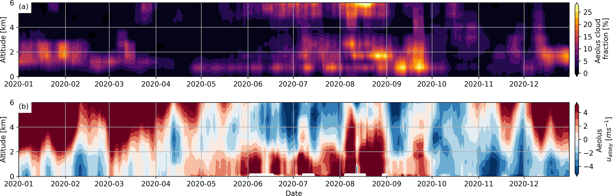 During the months of June–August, we observe a maximum of high cloud fraction over the Indian Ocean (Fig. 9e), as well as the Tropical Easterly Jet (TEJ) that extends from the Tibetan plateau to the Western coast of Africa (Fig. 9f). The core of the TEJ, located at about 16 km of altitude, is visible on the map (Fig. 9c) with westward winds exceeding 30 m s−1 over the Arabian Sea from June–August 2020 (consistent with Liu et al., 2024). We focused on a small domain located over the Indian Ocean on the Western coast of India and under the influence of the TEJ during summer (black rectangle, Fig. 9a). The domain extent of 20° of longitude ensures that Aeolus crosses it at least twice a day, once ascending and once descending. On the time series of wind profiles (Fig. 9f), westward (negative) winds appear in late May and reach values of above 30 m s−1 within a few days only. The jet persists until the last week of October before decaying rapidly, giving way to eastward winds (positive values) again. It is worth noting that during the same period of the TEJ, Aeolus captures persisting eastward (positive) winds below 2–5 km of altitude associated to the monsoon circulation. Figure 9e displays the daily average profiles of the cloud fraction observed by Aeolus over the same domain. The low cloud fraction is persistent during the entire year and above 30 % during early winter over the cold Arabian sea and during late September. We notice two minima of low cloud fraction which correspond to the reversal of boundary layer winds, in April from westward to eastward dominant winds, and in October from eastward back to westward dominant winds (more visible in Fig. B4). Note that during the weeks preceding and following the reversal of the boundary layer winds in April, low clouds are confined between the surface and 1 km of altitude, while during periods of continuous westward winds (January–March 2020), low clouds typically extend up to 3 km. Part of this seasonal cycle of cloud top height is explained by a cooler Sea Surface Temperature (SST) from January–February, favorable for higher cloud tops (Höjgård-Olsen et al., 2022), and a warmer SST afterwards. Moreover, during the reversal of the winds, the evaporation flux at the surface the Indian Ocean is reduced, resulting in a shallower and dryer boundary layer, less favorable for the formation of low clouds (Mieslinger et al., 2019, Nuijens and Stevens, 2012). We also observe mid-level and high clouds above 5 km and up to 16 km, preferentially occurring between June and October, i.e. when the TEJ is the most active. As this period also corresponds to the South-Asian Summer Monsoon (SASM), the presence of high convective clouds is not surprising. The concurrence of a strong TEJ and monsoon clouds and rainfall was already mentioned by e.g. Koteswaram, 1958. However, deep convective cloud cover accounts for only 9 % of the area of the Indian Ocean in July (Massie et al., 2002), and they are mainly located over the Bay of Bengal (Zuidema, 2003), thus the high cloud fraction seen in Fig. 9e between June and October must be essentially made of cirrus, as 90 % of them are located outside of regions of deep convection (Massie et al., 2002). The large increase of the cirrus cloud fraction during the period where the TEJ is the most vigorous is thus thought to be favored by horizontal transport of moist air originating from convective towers over long distances (Das et al., 2011). However, below and above the core of the TEJ, we observe wind shears larger than , which were found to alter cirrus clouds structure and reduce their lifetime (Jensen et al., 2025). Note that the time of ascending orbits of Aeolus (18:00 LT) corresponds to a maximum of deep convection over the Bay of Bengal (Zuidema, 2003), while descending orbits (06:00 LT) occur before the dissipation of cirrus clouds (Ali et al., 2022). Aeolus observations can thus be of a great help to better understand these interactions between horizontal winds and cirrus clouds.