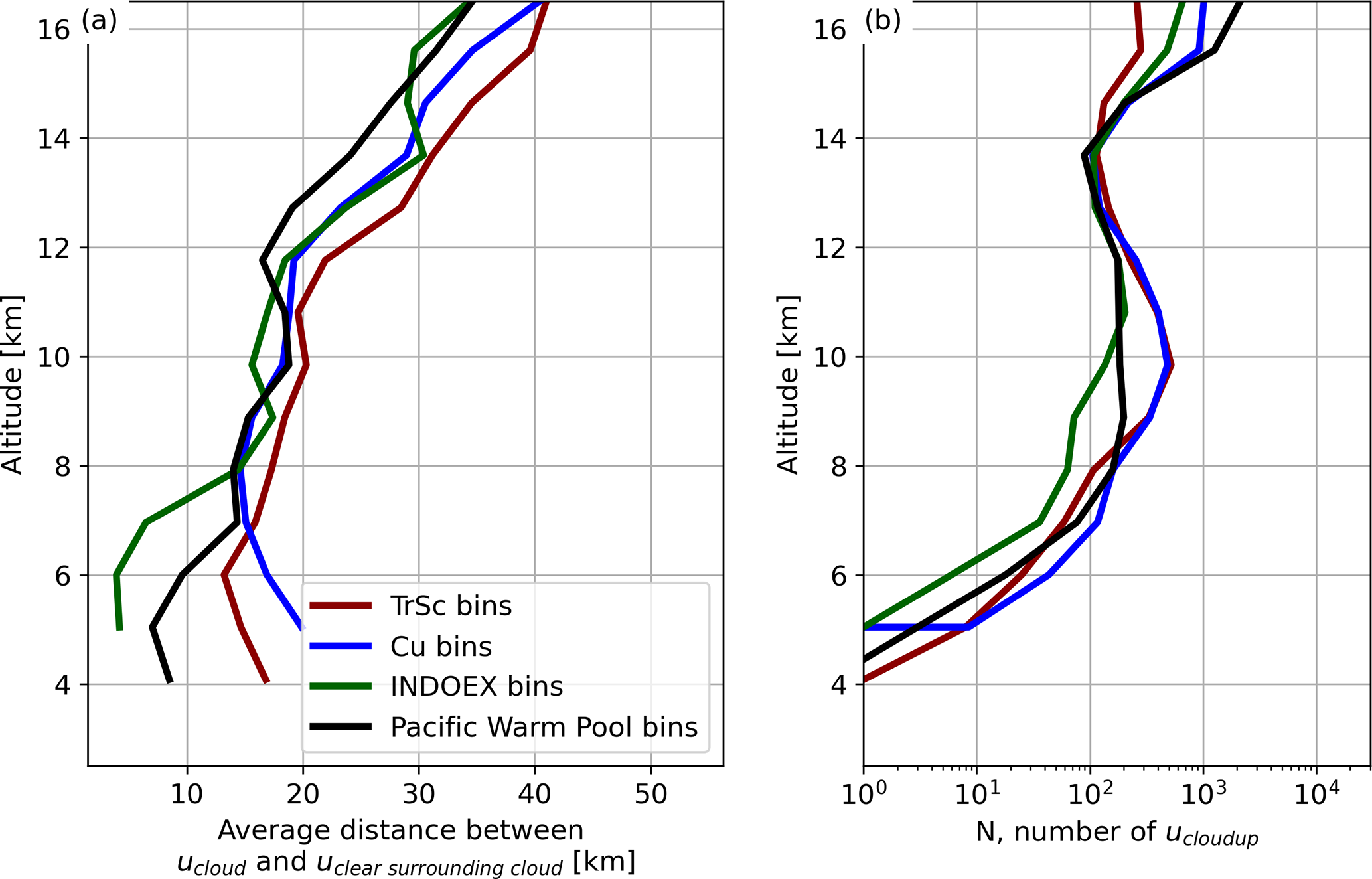 Figure 8a focuses on the wind shear between 16 and 18 km of altitude, which corresponds to the tropical tropopause. Sallsky mostly takes negative values within the tropics between and as the Quasi Biennial Oscillation is in a negative phase (fast westward winds in the stratosphere around z2), but Sallsky is positive and up to over the Indian Ocean as the Tropical Easterly Jet (TEJ, Koteswaram, 1958) blows westward up to 40 m s−1 at 16 km of altitude during the South-Asian Summer Monsoon (SASM). This region is also subject to deep convection, particularly over the Bay of Bengal (Zuidema, 2003; Hemanth Kumar et al., 2015), which then leads to cirrus clouds (Ali et al., 2022) distributed in the upper half of the troposphere, up to 16 km of altitude. Figure 8a shows that indeed, a cloud cover of 5 % is observed between 16 and 18 km of altitude, which corresponds to the highest clouds observed in this region (Ali et al., 2022). Jensen et al. (2025) demonstrated that wind shears of were favourable for a faster sublimation of cirrus clouds particles, reducing the lifetimes of these clouds.