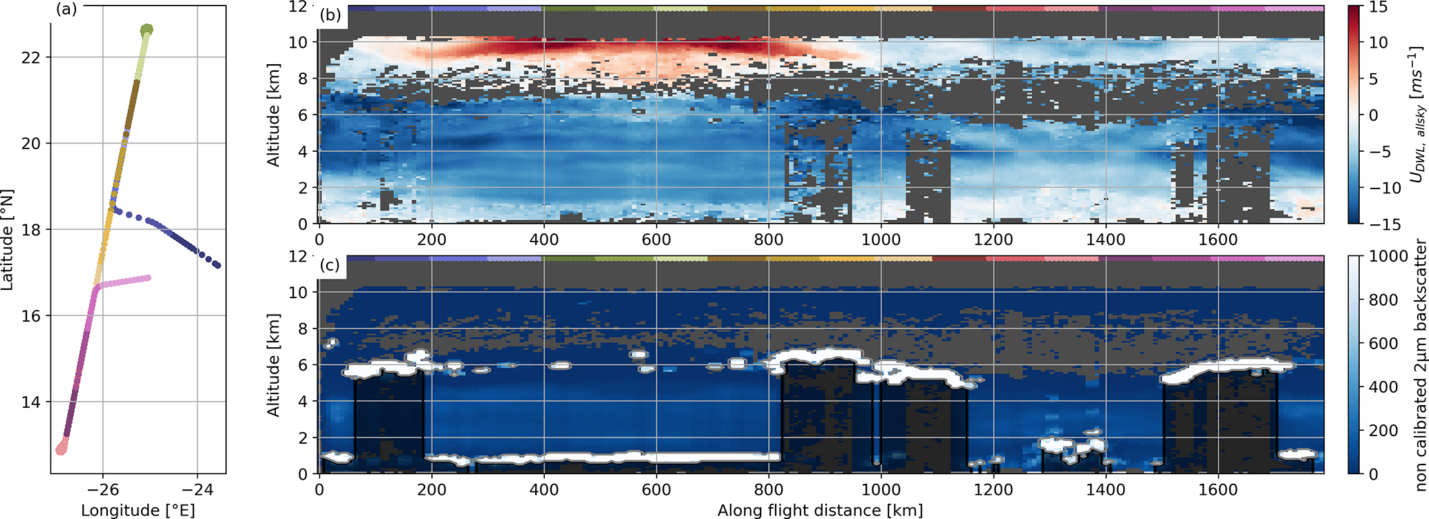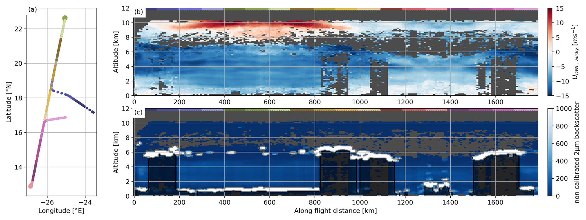First, we use profiles of wind acquired using an airborne 2 µm Doppler Wind Lidar (DWL) operated by the German Aerospace Center (DLR) onboard a Falcon aircraft during the AVATAR-T validation campaign of Aeolus. This Lidar has a spatial resolution of 200 m horizontally and 100 m vertically, extending between the surface and the aircraft which usually flies at about 10–11 km of altitude. To retrieve the horizontal wind, an azimuth scan is applied and takes about 42 s, leading to a horizontal resolution of about 8 km (Witschas et al., 2017, 2022). The systematic error of horizontal wind measurements is estimated to be 0.1 m s−1 and the random error about 1 m s−1. A total of 8250 km was scanned by the aircraft near Cape Verde during the 5 flights we selected. A first selection is made to discard bins with an uncalibrated backscatter superior to 500 (that we estimated a good threshold to discriminate clear and cloudy sky). We first project the wind as if it was observed by Aeolus during its descending orbit and we average the wind vertically to a resolution similar to that of the Aeolus dataset, 480 m.