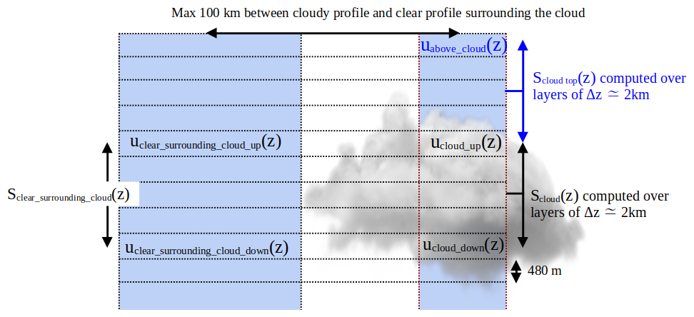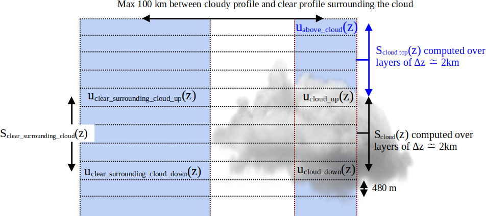 Clouds play a critical role in Earth's climate as a major component of the water vapor cycle and because they have a large impact on the radiative budget at the top of the atmosphere and at the Earth surface. The formation and development of clouds are controlled by the surface temperature and by the thermodynamic structure of the lower troposphere, but also by dynamic variables. It was shown that fast horizontal winds are responsible for an increased cirrus cloud cover through different mechanisms like advection of humidity from warmer to cooler regions, favoring the in-situ formation of cirrus clouds (Das et al., 2011). Deep convective cloud systems tend to form in regions of large-scale wind convergence. They organize into rain bands and squall lines by the wind shear (e.g., Thorpe et al., 1982; Rotunno et al., 1988; Parker, 1996; Hildebrand, 1998; Robe and Emanuel, 2001; Weisman et al., 2004; Abramian et al., 2022). The wind shear can also inhibit deep and shallow convection by “blowing off” cloud tops (e.g., Koren et al., 2010; Sathiyamoorthy et al., 2004), or increase the cloud cover by tilting cloud tops away from their base (Mieslinger et al., 2019), thus influencing cloud-top height and cloud cover (Helfer et al., 2020). Over marine boundary layers, the wind shear can even locally deplete stratocumulus cloud tops (Wang et al., 2008; Schulz and Mellado, 2018). Reversely, clouds can have an influence on winds through their radiative effect. Fujiwara et al. (2003) showed that the radiative cooling associated to anvils creates a temperature gradient at the top of high convective clouds, that can generate a thermal wind. At a large scale, it was shown that the cloud radiative effect impacts the intensity and location of the jet stream by altering temperature gradients and redistributing energy within the atmosphere (Voigt et al., 2021).