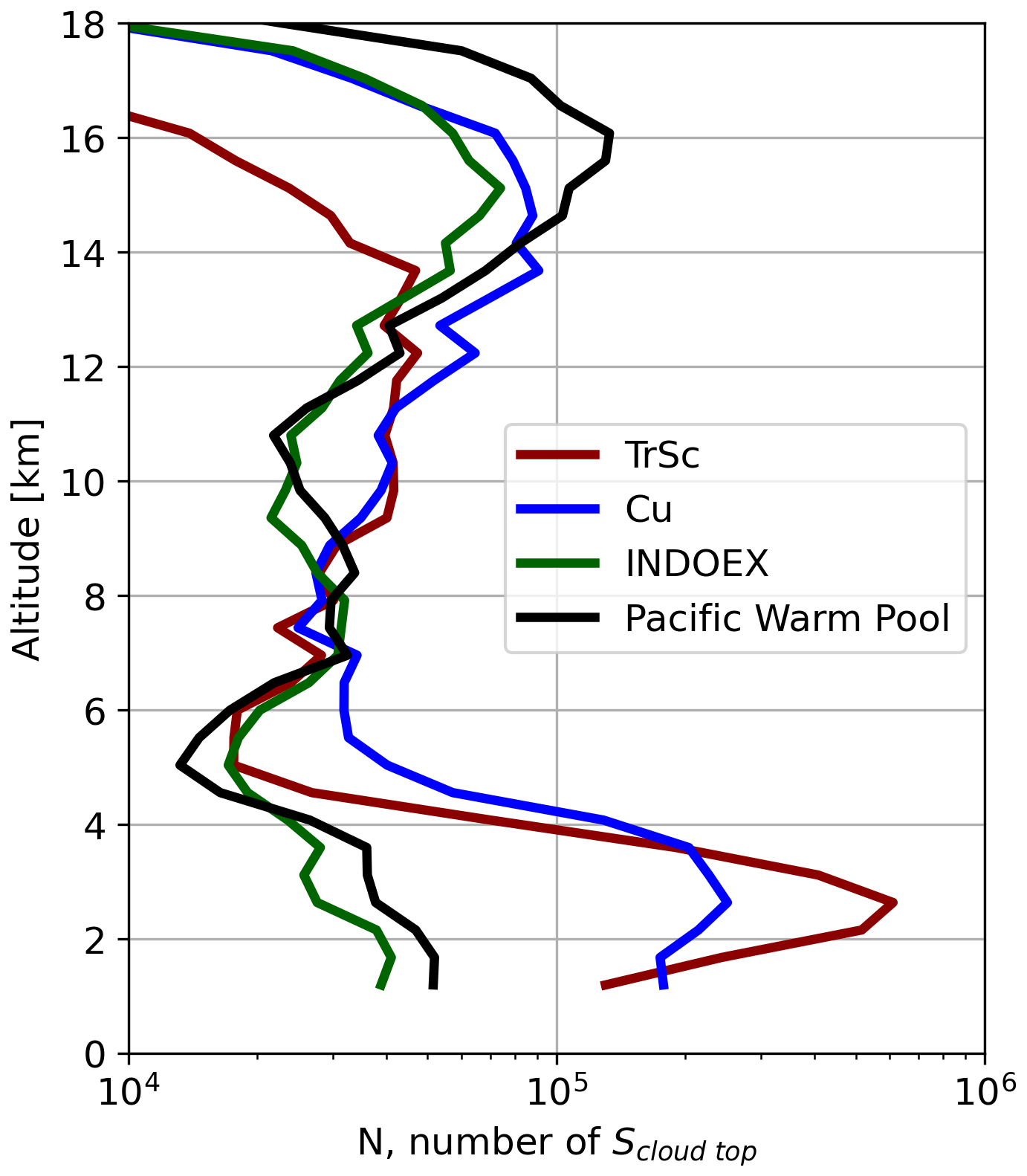 We split the study within regions (Fig. 11a) exhibiting different types of clouds and different large-scale circulations and we focus on the entire year 2020. The first region is dominated by Stratocumulus decks sometimes transitioning to Cumulus clouds (TrSc). They are prevalent in the eastern subtropical oceans (Wood, 2012) and are capped by a strong inversion, usually created by the large scale subsidence associated with the descending branch of the Hadley–Walker circulation. The inversion is characterised by a sharp transition in most meteorological variables (Wang et al., 2008; Hourdin et al., 2019). The second region is dominated by Cumulus clouds (Cu) (McCoy et al., 2017; Qu et al., 2015). Cumulus clouds are usually found in the western subtropical oceans and are associated with a deeper boundary layer compared to the Stratocumulus region (Scott et al., 2020). These two regions are found above oceans and usually under the subtropical jet streams. The Indian Ocean is the third region, thermodynamically more unstable and prone to deep convection, it is also crossed by the Tropical Easterly Jet during boreal summer. The boundaries of this region are adapted from the INDian Ocean EXperiment (INDOEX, Mitra, 2004) in order not to overlap other boxes. Finally we choose a fourth region over the Pacific Ocean and between the latitudes of 10° S and the equator, referred below as the Pacific warm pool region (WP) and characterised by SST up to 32 °C (Jauregui and Chen, 2024), favourable for deep convection.
