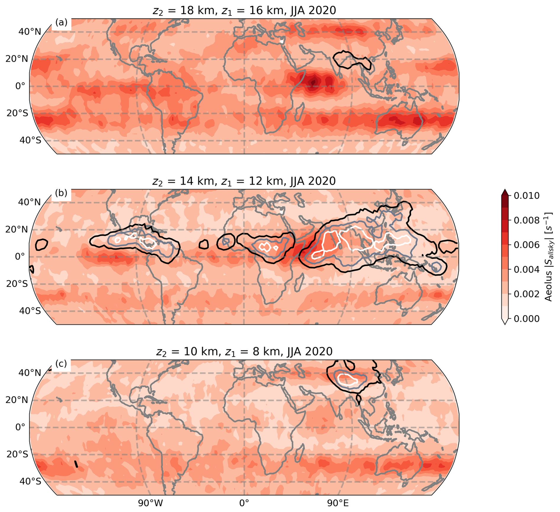 Figure 8Map of the median wind shear Sallsky calculated (a) between 8 and 10 km, (b) between 12 and 14 km and (c) between 16 and 18 km from June–August 2020. Contours represent cloud covers of 5 %, 10 %, 15 % and 20 % for each altitude range.
