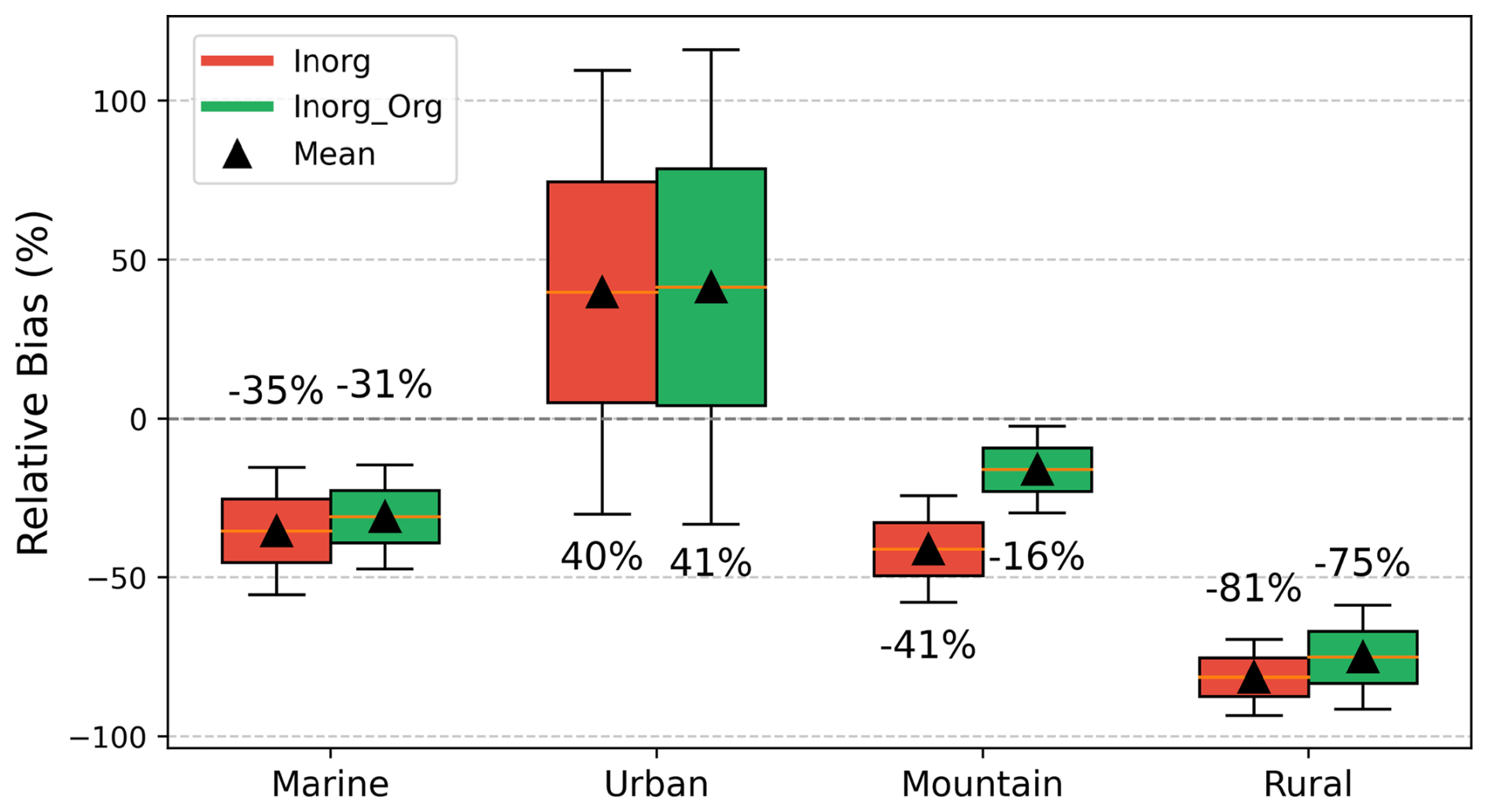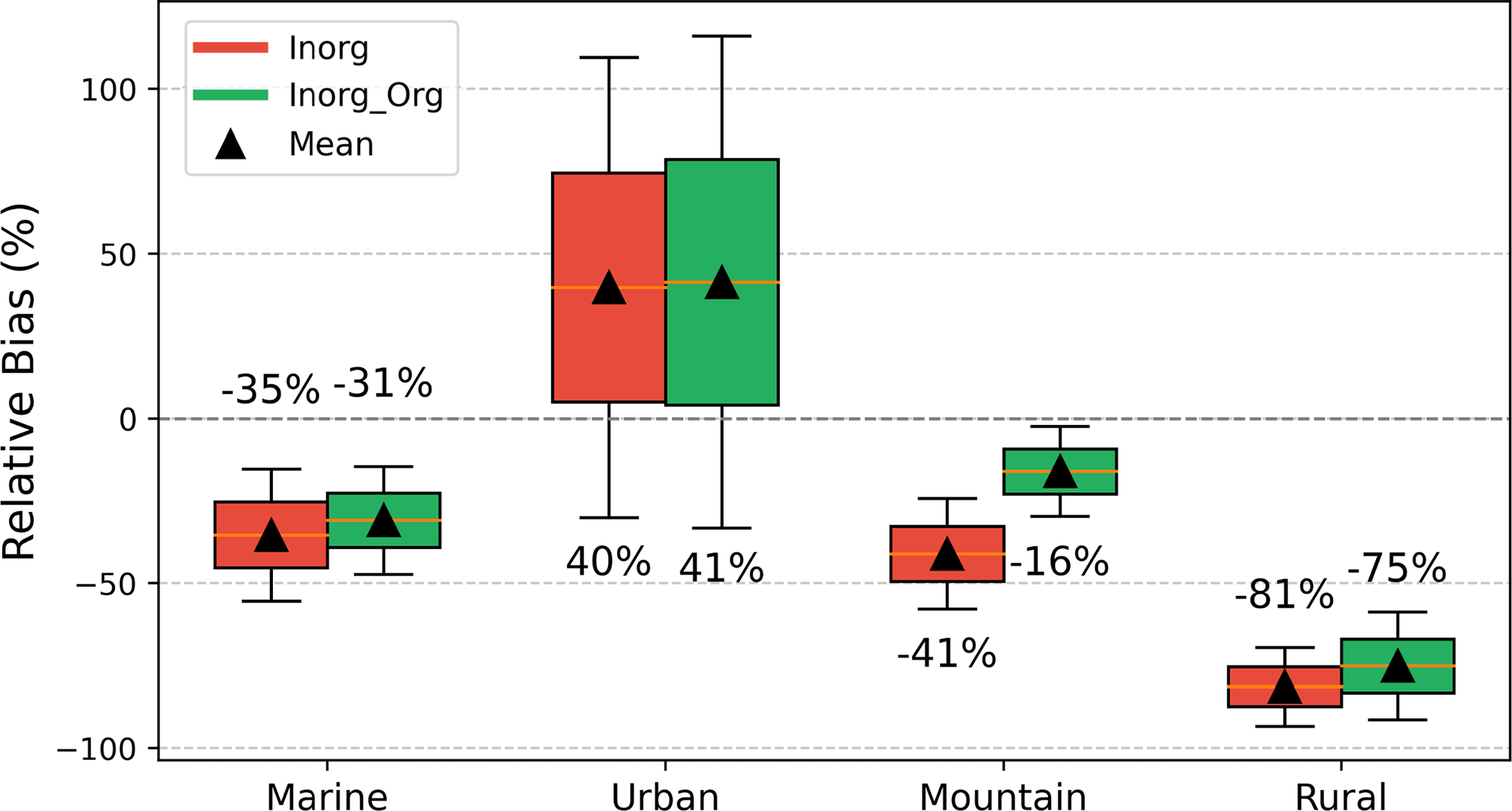 Figure 1Box plots showing the relative bias (%) between simulated monthly mean and observed median CCN number concentrations across categorised background sites (Marine, Urban, Mountain, Rural). Red and green boxes represent the Inorg and Inorg_Org experiments, respectively. Black triangles indicate the mean relative bias for each category. Numerical values above the boxes denote the corresponding mean normalised mean bias (NMB) for each experiment. Information on the measurement sites is provided in Table 2.
