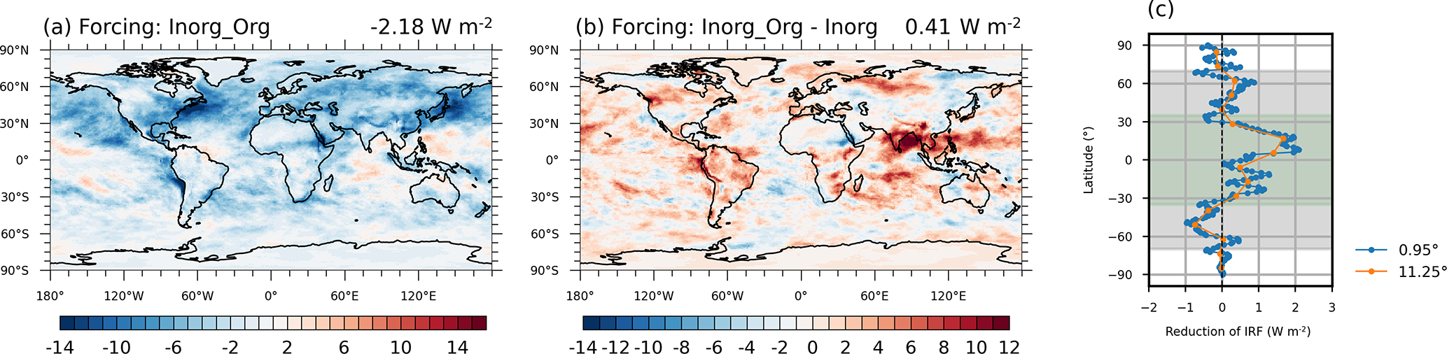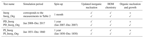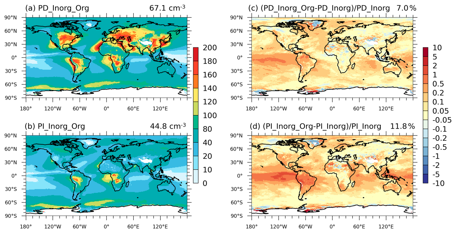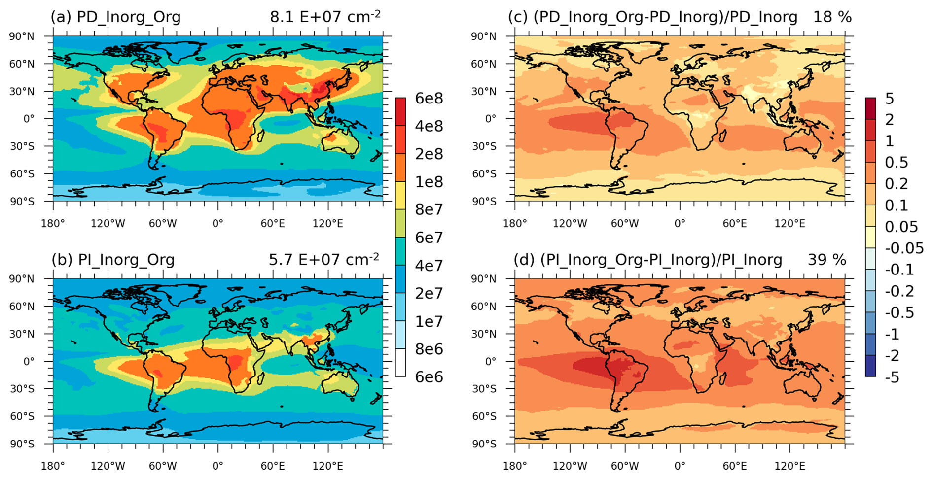 We calculated the ERFaci between preindustrial (PI) and present-day (PD) cases using the methodology from Ghan (2013). The effect of biogenic organic NPF on the magnitude of ERFaci was calculated by comparing simulations with (using Eqs. 2–8 in Shao et al., 2024, named “Inorg_Org” in Table 1) and without (using only Eqs. 6–8 in Shao et al., 2024, named “Inorg” in Table 1) biogenic NPF mechanisms. The prefixes “PD” and “PI” in each test name represent emissions scenarios appropriate for the present-day and preindustrial periods (Table 1).