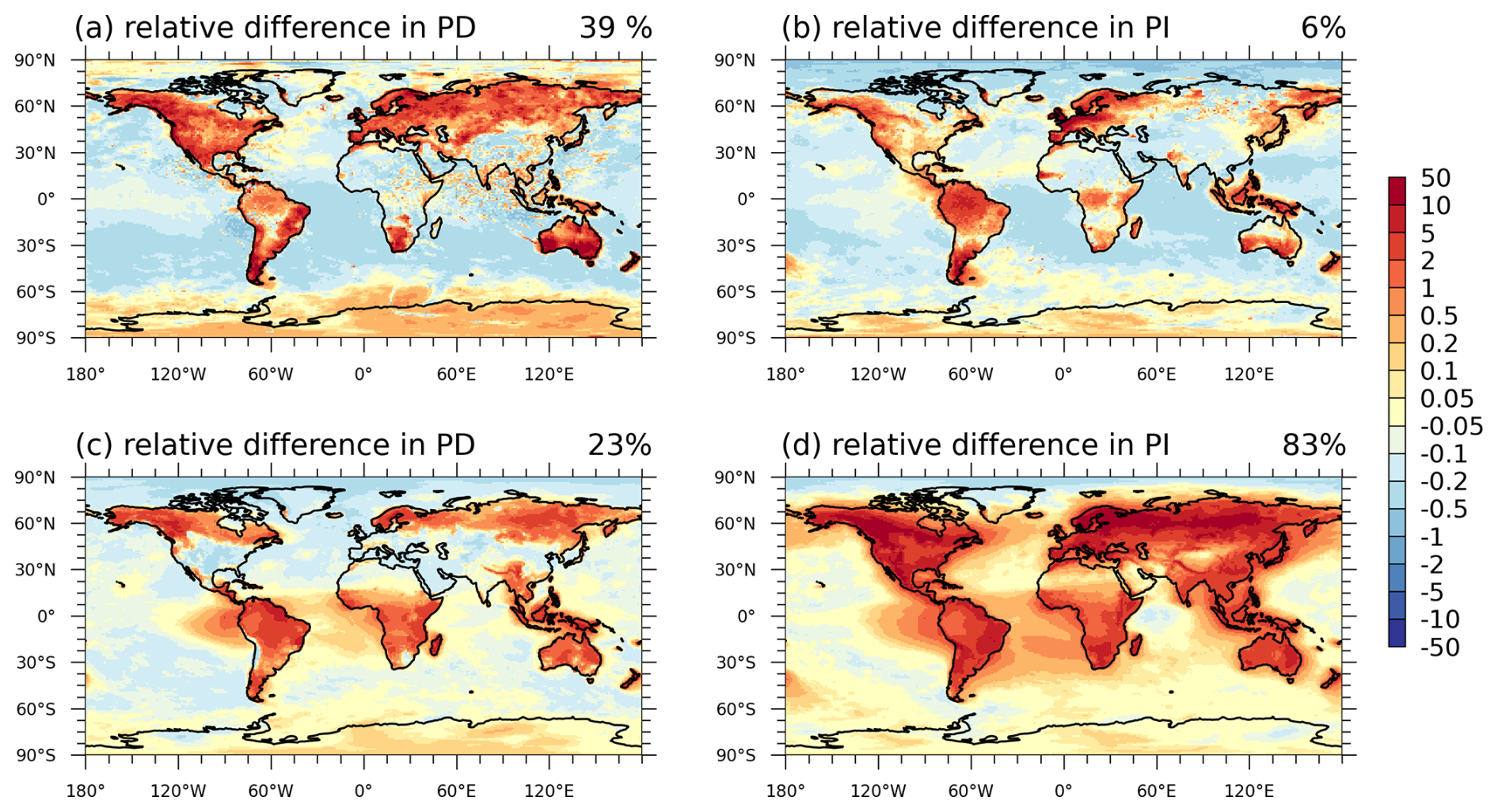 In both the PD and PI experiments, the largest increase in CCN burden (>20 % rise in Inorg_Org compared to Inorg) is found in the tropical regions (Amazon, central Africa, and Southeast Asia) (Fig. 2). This is attributed to the highest biogenic emissions (Fig. S3), which lead to the greatest increases in both nucleation and growth rates in Inorg_Org (Fig. 4) and the originally low aerosol number before adding organic NPF (i.e. Inorg simulation) in these regions. The enhancement in nucleation rates due to the inclusion of organic nucleation is more significant in the PD experiment (39 %) compared to the PI experiment (6 %) (Fig. 4). This is mainly caused by higher sulfuric acid concentrations in the PD environment (Fig. S2), resulting in higher heteromolecular nucleation rates involving sulfuric acid and organics (Figs. S6 and S7) over land, where both H2SO4 and HOMs show high values. Consequently, more H2SO4 is consumed over land (Fig. S16), reducing its transport to oceanic regions (Fig. S17). As a result, nucleation rates decrease over the ocean in both PD and PI experiments (Fig. 4). In contrast to organic nucleation, the impact of the organic growth rate on the total growth rate is more significant in the PI atmosphere, reaching 83 %, while in the PD atmosphere, this impact is only 23 %. This is mainly due to significantly higher emissions of organic precursors, such as monoterpenes and isoprene in the PI atmosphere (Fig. S3), and the organic growth rate is influenced only by the HOM concentrations. Therefore, compared to the increase in the ∼1.7 nm nucleation rate, the increase in the sub-20 nm growth rate plays a more significant role in greater increase of CCN burden in the PI experiment (Figs. 4 and S13). The strong correlation (R∼0.7) between organic growth rates and CCN burden (Fig. S15), along with the lack of substantial changes in other components of the CCN budget (Table S5), further supports this point.