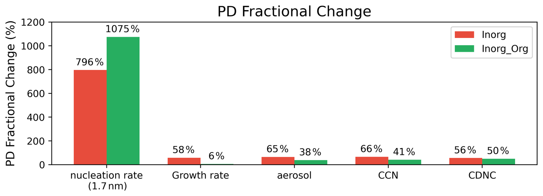 We estimate that the global ERFaci since 1850, after including organic NPF, is −2.18 W m−2 (Fig. 6a). The calculated aerosol ERFaci decreases by approximately 0.4 W m−2 (corresponding to a 16 % reduction) after adding organic NPF mechanisms (Fig. 6b). The global mean effective radiative forcing due to aerosol–radiation interactions (ERFari) changes only slightly, from 0.03 to −0.01 W m−2, a negligible change compared to the total aerosol radiative forcing, which decreases from −2.19 to −2.64 W m−2 (Table S4). This reduction is attributed to the greater increase in CCN number in the PI experiment compared to the PD experiment (Fig. 2) when adding organic NPF (Inorg_Org), leading to a smaller relative difference in these variables between the PD and PI experiments (66 % in Inorg_Org and 41 % in Inorg; Fig. 7).