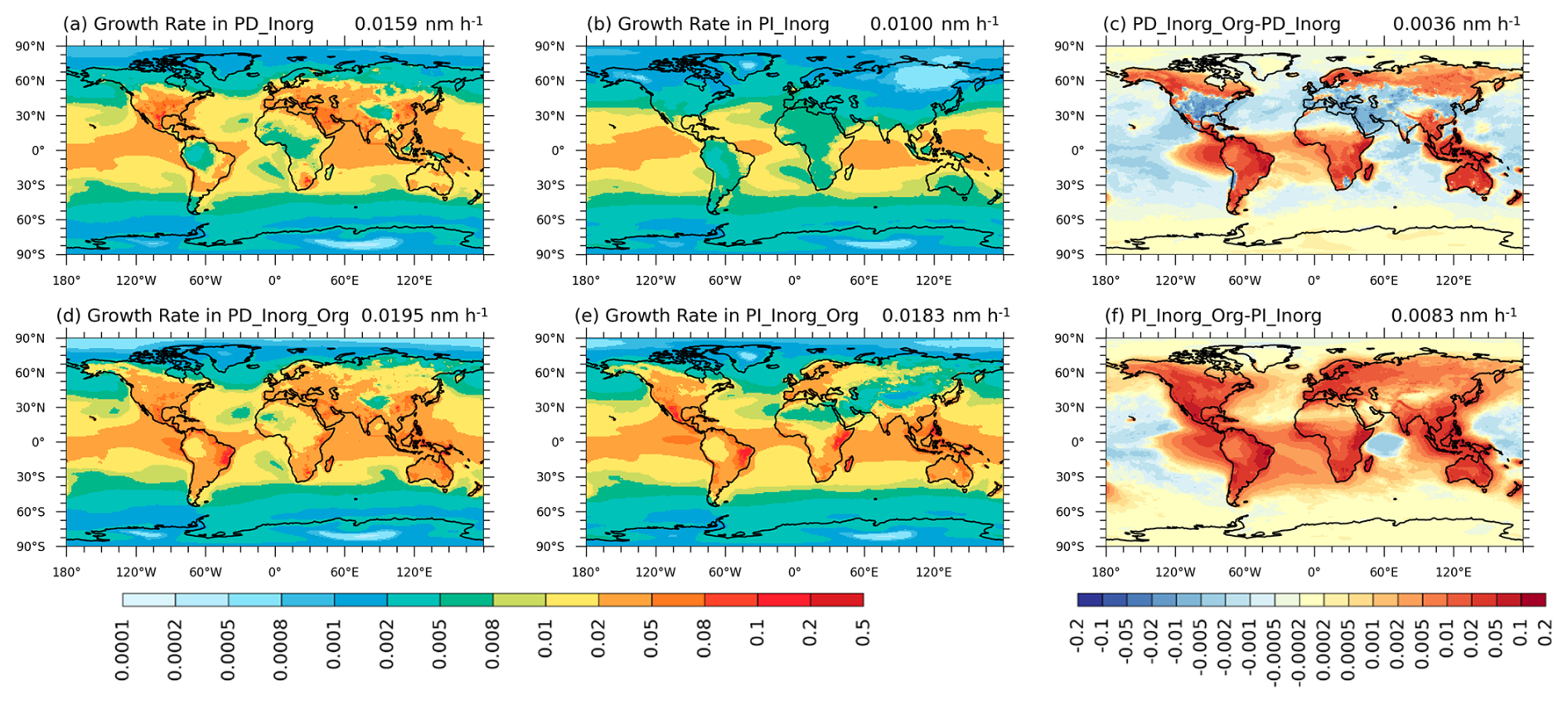 Figure 8Spatial distribution of the simulated vertically mean growth rate in the (a, d) PD and (b, e) PI experiments. The difference between Inorg_Org and Inorg in the PD and PI experiments is shown in (c) and (f) (unit: nm h−1). Global mean values are shown on the top right of each figure.