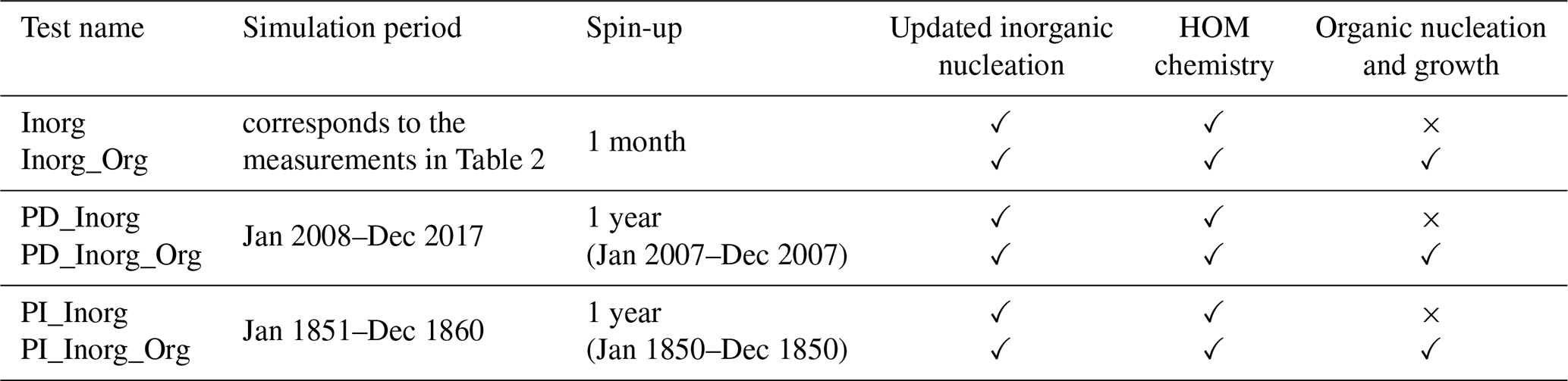 The model and field measurements used in this study are documented in Sect. 2. Section 3 evaluates CCN number concentrations in the updated model. Section 4 quantifies the contributions of organic NPF to CCN number globally in both present-day (PD) and PI environments. The change in effective radiative forcing due to aerosol–cloud interactions (ERFaci) associated with organic NPF processes is also calculated. Results are summarised and discussed in Sect. 5.