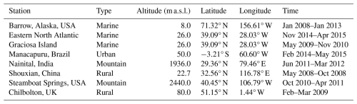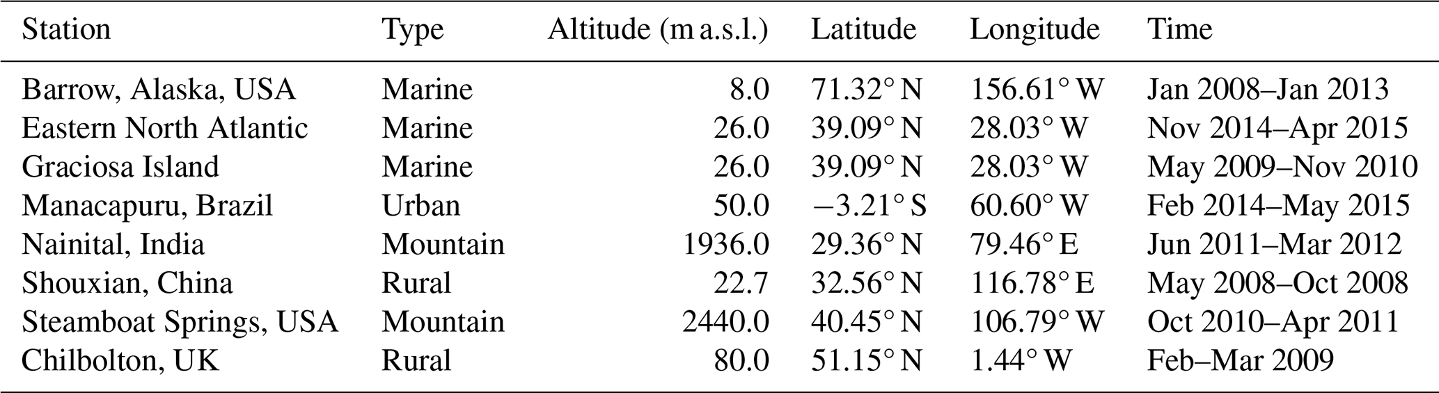 The observational data of CCN number concentrations used in this study were obtained from ships, stations, and aircraft at various locations (see Table 2) (Jefferson, 2010; Uin et al., 2019; Bodhaine, 1983; Wang et al., 2022; Wood et al., 2015; Zheng et al., 2020) (all the data are available for download at http://www.archive.arm.gov/discovery/#v/results/, last access: 20 December 2025). All data were processed within the Global Aerosol Synthesis and Science Project (GASSP) (Reddington et al., 2017). The CCN number measurements exhibit a very high temporal resolution (<1 min). However, the model output's physical time step is only half an hour, making it impossible to precisely match the observation data with the model output. Consequently, we selected CCN number concentrations at supersaturations (ss) of 0.1 %, 0.2 %, 0.5 %, and 1 % from the observational data to represent different atmospheric supersaturations. These values were then compared with the model's monthly average output at the same supersaturation levels for the corresponding time period (Fig. 1).