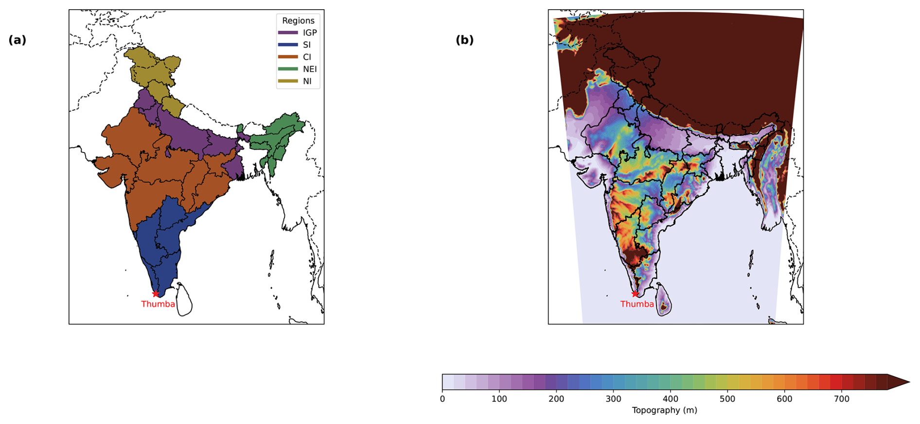 Figure 1(a) Outlines showing each geographical region of the Indian landmass according to Survey of India (2024) and (b) the topographical height contour of the model domain. CI stands for Central India, NEI for North East India, NI for North India, SI for South India, and IGP for the Indo Gangetic Plain regions.