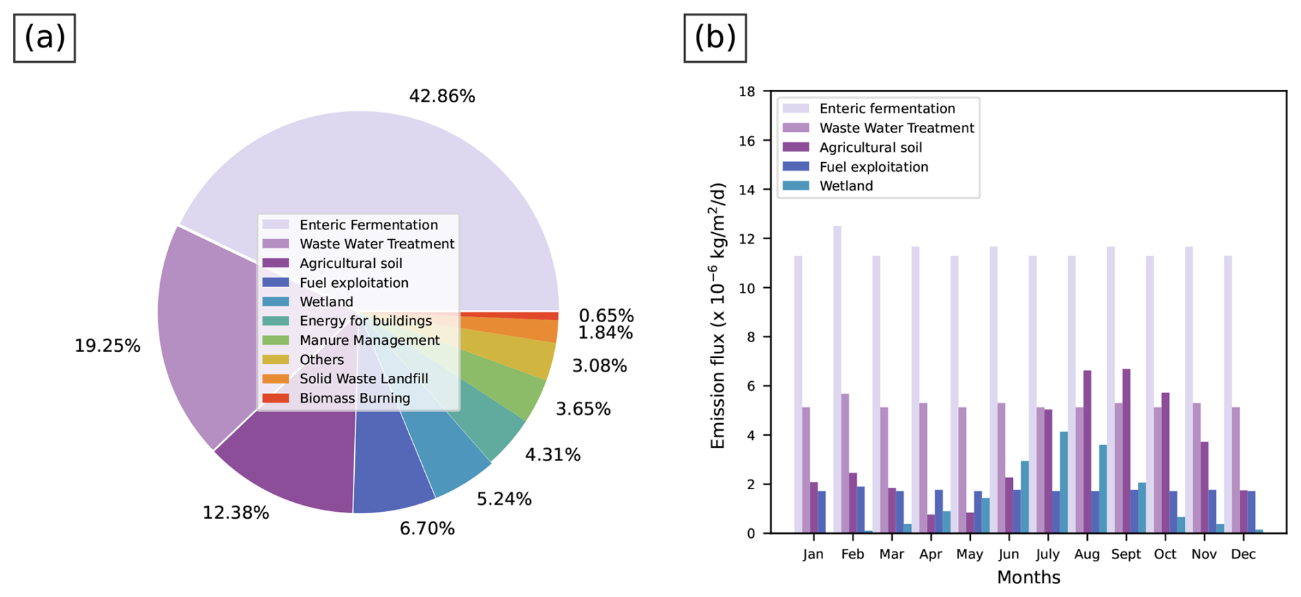 Figure 2(a) The percentage of contributions of different CH4 sources towards total annual emission flux over the Indian domain, (b) monthly contribution (calculated from the EDGAR temporal profiles described in Crippa et al.2020) from each source.