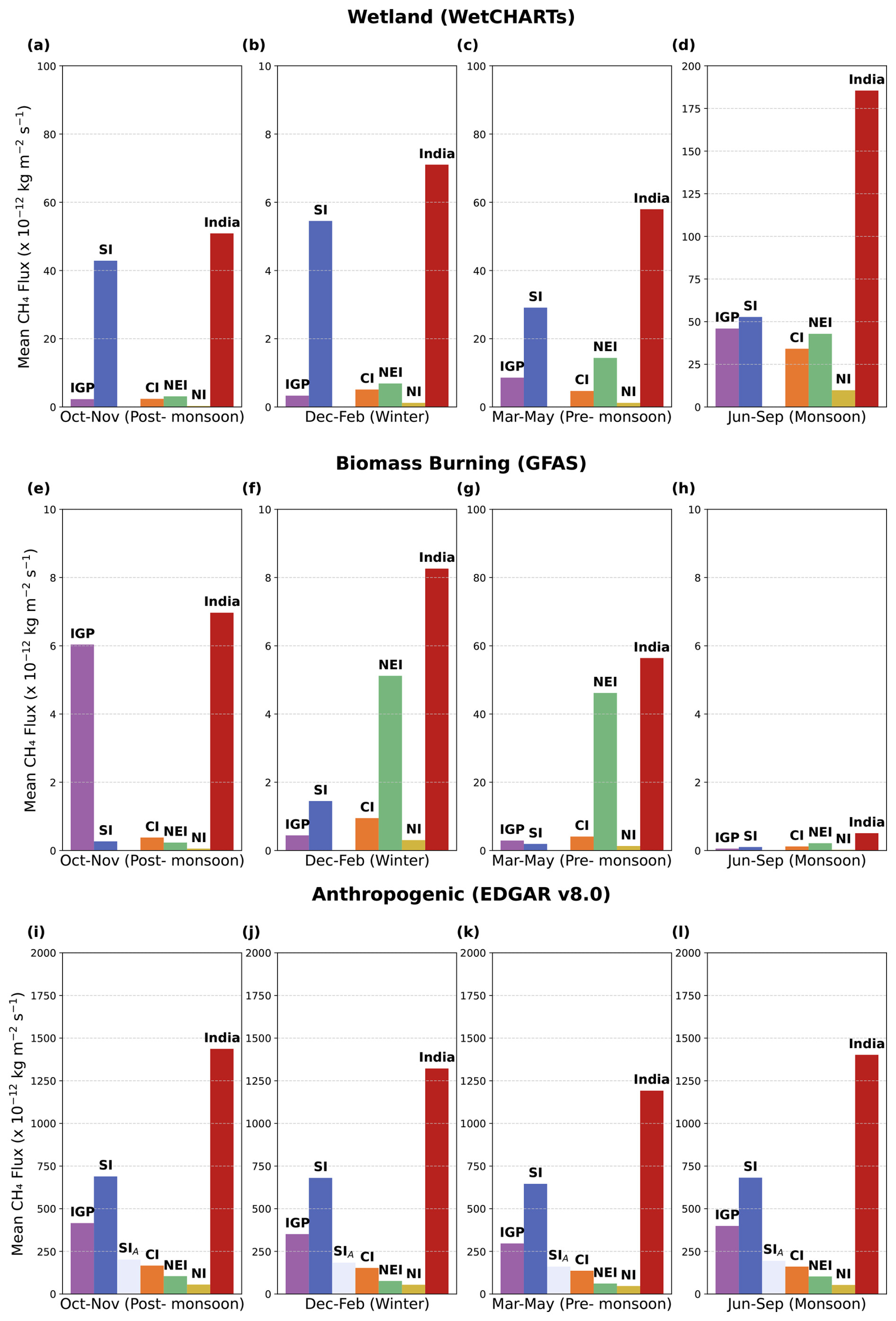 Based on WetCHARTs (version 1.3.1), natural wetland emissions are approximated at 1.7 Tg yr−1, with peak emissions occurring from June to September ( 185 × 10−12 kg m−2). The highest wetland emissions (>25× 10−12 kg m−2 s−1) are seen over the SI region in June–September, October–November, and March–May, with a peak of  50 × 10−12 kg m−2 s−1 (Fig. 3). These peaks are likely due to increased waterlogged areas during the monsoon (Fig. 2b). Biomass burning emissions, smaller than wetland and anthropogenic emissions, peak in March–May in most regions except the IGP, where crop residue burning occurs from October to November (Deshpande et al.2022, 2023). The North East India (NEI) region shows the highest biomass burning emissions in March–May (∼47× 10−12 kg m−2), likely due to slash-and-burn practices before planting (Deshpande et al.2023. Total emissions, combining anthropogenic (EDGAR), wetland (WetCHARTs), and biomass burning (GFAS) emissions, peak in October–November and June–September, with the SI region contributing the highest share (49.2 % and 46.4 %, respectively), and 52 % in March–May and 51.7 % in December–February (Fig. S5).