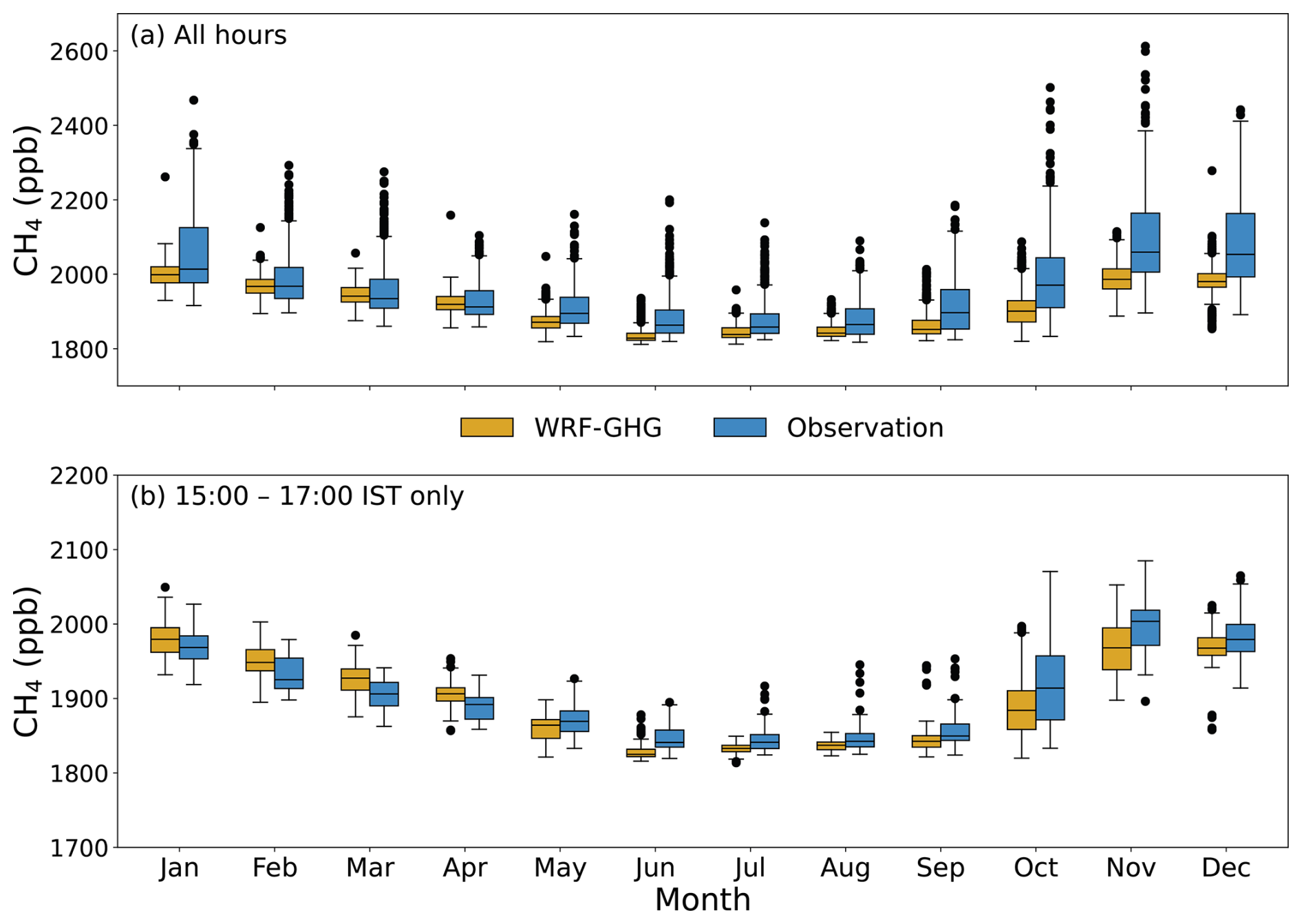 Figure 4Monthly distribution of observed and WRF-GHG simulated CH4 mixing ratios at Thumba for 2018 & 2019 for (a) all hours and (b) only 15:00–17:00 Local Time (IST hours) (25th and 75th quartiles; see the site location as denoted in Fig. 1). Note that the ranges of the y-axes are not uniform in panels to improve visibility.