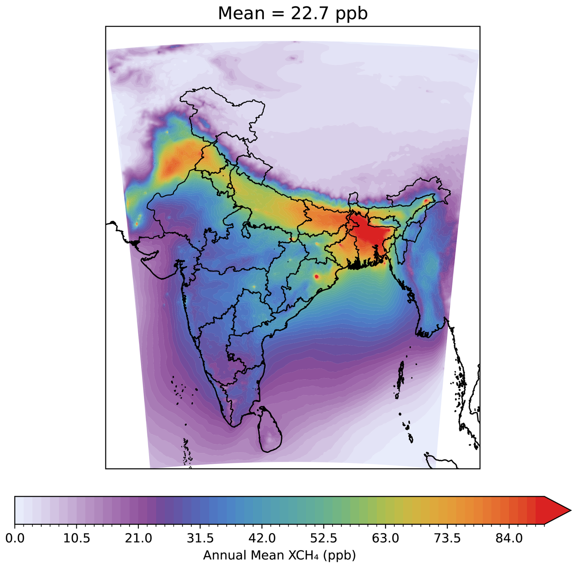 To assess the model's performance at the surface level, a comparative analysis was conducted using CH4 in situ measurements from a ground-level pollution monitoring station in Thumba (8.5° N, 76.9° E) as denoted in Fig. 1 for 2018 & 2019. Located in southwestern India, Thumba is a tropical coastal station approximately 10 km northwest of Thiruvananthapuram and 500 m inland from the Arabian Sea. This site reflects local to regional influences, but cannot capture the full spatial variability across India. CH4 concentrations were measured using a greenhouse gas analyzer (model: 911-0011-1001) by Los Gatos Research, USA, based on the off-axis integrated cavity output spectroscopy (OA-ICOS) method (Baer et al.2002; Raju et al.2022; Sijikumar et al.2023; Uma et al.2024). Air samples were collected from about 10 m above ground level (a.g.l.) using the analyzer's internal pump. Calibration was performed periodically. However, it should be noted that the instrument can be sensitive to temperature, requiring frequent calibration, which was not regularly met. Measurements were recorded at 1 s intervals, with hourly averages used for subsequent analysis. CH4 measurement uncertainty is 0.25 % (i.e. 5 ppb with respect to 2000 ppb of CH4) and the reported precision (1σ) is 1 ppb.