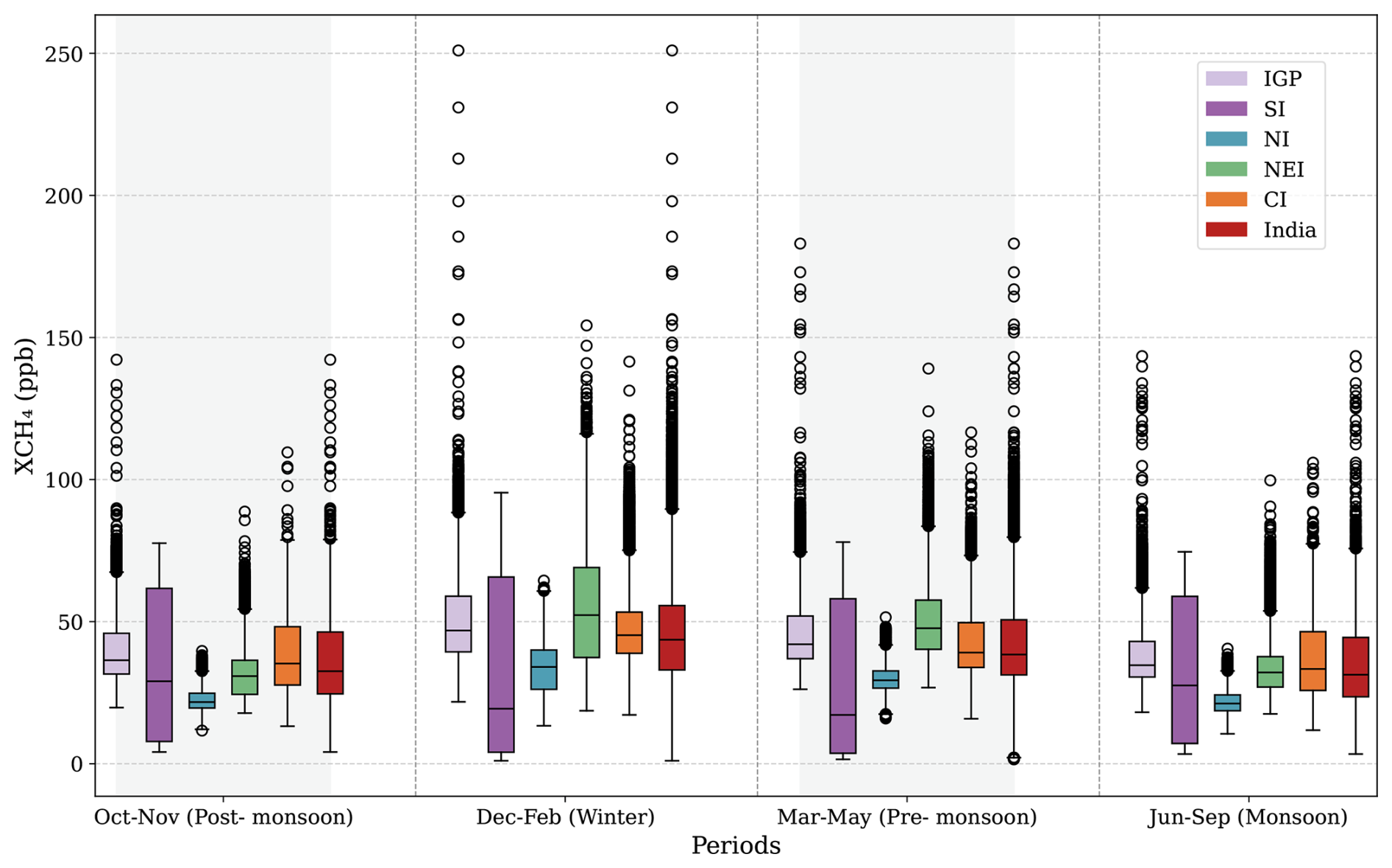 Figure 6 shows the regional variability of anthropogenic XCH4 enhancements across different parts of India as shown in Fig. 1. The highest regional magnitudes and variability in mixing ratio enhancements occur in the winter season. Here, consistently high magnitude in spatial distribution is found over the IGP region (with a median of ∼50 ppb), showing maximum values over the SI region (∼90 ppb) owing to emission hotspots. During winter, the NEI shows high XCH4 enhancements, with values reaching up to 115 ppb (with a median value of ∼60 ppb). Winter peaks in XCH4 likely arise from stable atmospheric transport that carries and concentrates emissions from the preceding October–November period. From June to September, SI enhancements reach up to ∼75 ppb (with a median value of ∼25 ppb). A similar trend is seen for 2019 (Figure not shown). SI exhibits the widest interquartile range with the lowest minimum value, a relatively low median, and the highest maximum in most seasons, indicating the influence of hotspot emissions, as discussed earlier in Sect. 4.1.