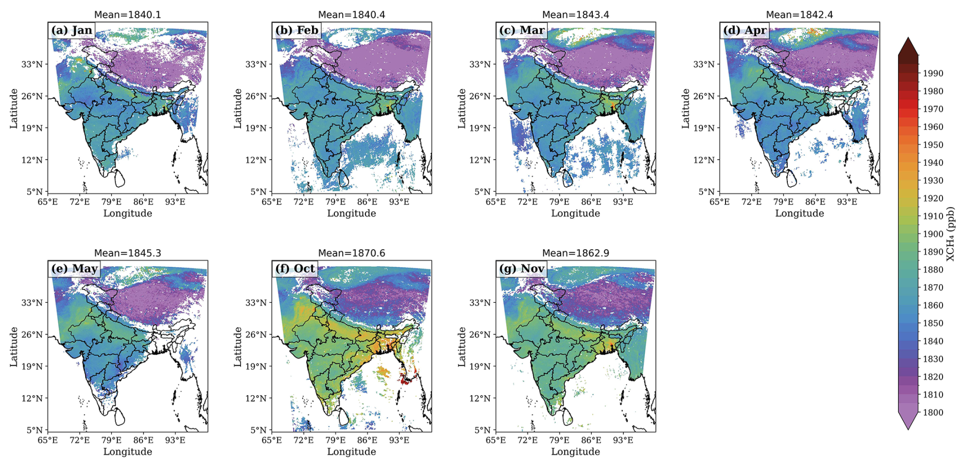 In this section, we present our comparisons of WRF-GHG simulations with TROPOMI observations of total XCH4 in 2018, considering all months in which reasonable amounts of satellite measurements are available after filtering. The details of filtering are provided in Schneising et al. (2023). TROPOMI observations show distinct seasonal variations in the large spatial domain (Fig. 7), possibly resulting from both atmospheric transport and surface emissions variations. Observations indicate highest values in the mean spatial distribution of XCH4 from October to November within the range of  1862 to 1870 ppb. These seasonal increments can be attributed to the combination of surface emissions, boundary layer height, and horizontal transport, which accumulates the effect of the distribution of tracers at lower atmospheric levels. These increased regional emissions, especially from anthropogenic sources, are also seen in Figs. S2 & 3, which are typical for some parts of India, like the SI and IGP, during the October–November season. However, we cannot neglect the likelihood of bias in the observations due to high aerosol loads, which impacts XCH4 retrievals (Lorente et al.2021; Hu et al.2018; Pandey et al.2019). All the months show significantly higher total XCH4 mixing ratios over the IGP region in comparison with the other regions over India. The IGP region is more prone to biomass burning in October and November, causing more aerosols in the region. We have examined the particulate matter (PM2.5) content using the MERRA database, which indicates a heavier aerosol content due to burning during the winter, not always necessarily peaking in October but during the December–February season (Figure not shown). There is a gradual increase in XCH4 mixing ratios beginning from the winter month of January till March, with a slight dip in April and then a distinctly high increment in October (exceeding 1870 ppb) in October over the IGP (see Fig. 7a–f).