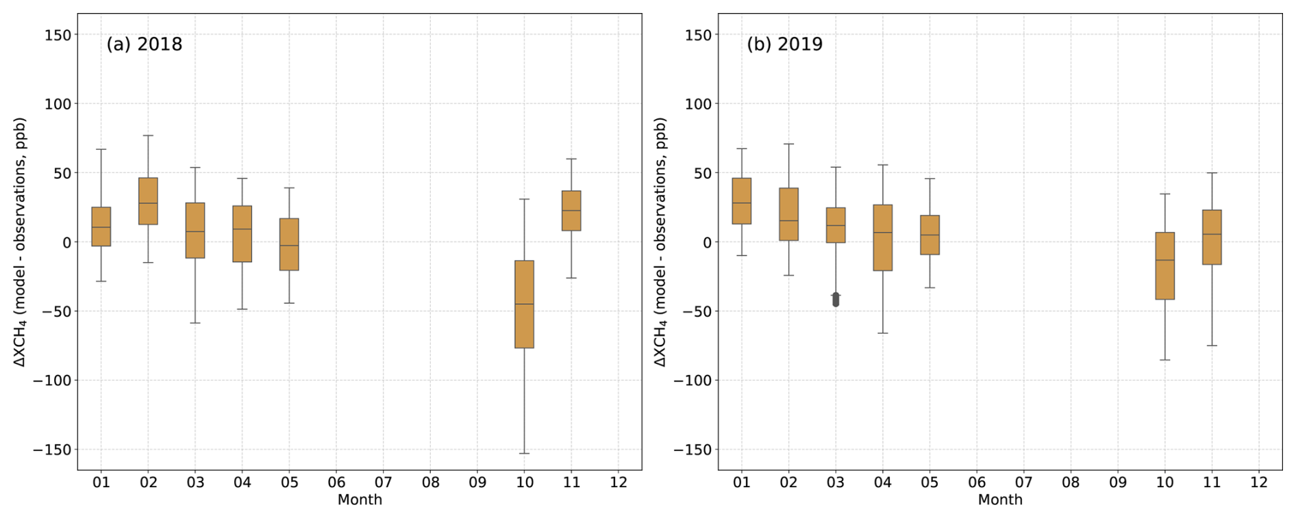 In general, the WRF-GHG simulations tend to show high bias in the winter months (see Fig. 9). A definite and widespread underestimation by the model was found in October 2018. However, in 2019, WRF-GHG was almost able to capture the observed XCH4. In the summer months, the model shows patterns of overestimation in eastern India and underestimation in western India. These regional differences in patterns of XCH4 can arise from heterogeneous sectorial distributions of surface emissions with seasonality that would have been misrepresented in the inventories in conjunction with the large-scale meteorological influences (e.g. southwest monsoon over India, Chandra et al.2017).