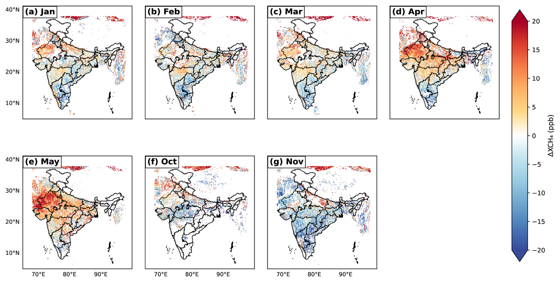 In this section, we discuss the mixing ratio enhancements in the atmospheric column in response to spatial and temporal distributions of regional sources for the period 2018–2019. i.e. by considering only contributions from the sum of anthropogenic and biomass-burning emission sources (mostly human-influenced in India, i.e, from agricultural residue burning and managed fires) over the model domain and not using CAMS-derived background XCH4 (see Sect. 2.2). As mentioned in Sect. “Estimating optimized CH4 flux over India”, we have also omitted the wetland (biogenic) component here since it contributed negligibly to the column-mixing-ratio enhancement (see Figs. S9 & S10). The IGP region exhibits significant XCH4 enhancements (from 27 to 67 ppb) from regional sources attributed to anthropogenic and biomass-burning fluxes (see Fig. 5). Seasonally, the highest XCH4 enhancements occur during winter (with a maximum of  251 ppb in January; see Fig. S11) over India. The minimum enhancement for the whole Indian domain occurs during the monsoon season (June–September), likely due to a combination of higher boundary layer heights and stronger winds, which enhance vertical and horizontal transport affecting column CH4 concentrations. The concentrations may also be impacted by the seasonal changes in regional or larger fluxes (>1000 km); however, further investigation is needed to assess their contributions.
