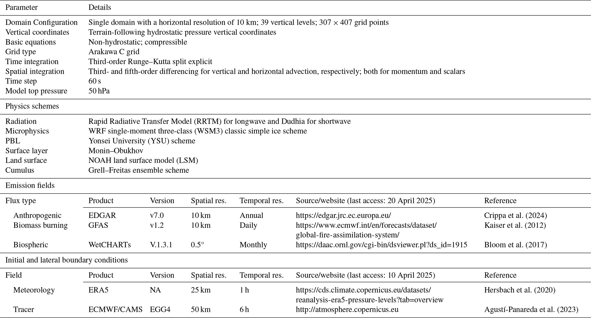 WetCHARTs is an ensemble dataset that provides gridded emissions data from 2001 to 2019 at a resolution of 0.50° × 0.50° (Bloom et al.2017), which were then re-gridded to 0.1° × 0.1° with a temporal resolution of 1 h. The simulated total atmospheric CH4 mixing ratio thus contains contributions from the initial fields as well as anthropogenic, biomass burning, and biogenic fields of CH4. Table 1 summarizes the WRF-GHG model set-up used in this study. The general meteorological configuration for the WRF-GHG model set-up applied here is described in Thilakan et al. (2022).