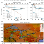 Upper-air radiosonde data were obtained from the University of Wyoming dataset (University of Wyoming, 2024). The radiosonde data encompassed the balloon's precise trajectory, detailing latitude, longitude, altitude, and time. This information is crucial, as radiosondes can drift significantly from their launch sites during ascent. Balloons may drift approximately 5 km in the mid-troposphere, around 20 km in the upper troposphere (Seidel et al., 2011). Knowing the balloon's trajectory enables matching its observations to the nearest model grid point in both space and time. For example, a balloon launched at 12:00 UTC requires several minutes to reach cruising altitude, so temporal alignment is also necessary. The drift distance was therefore calculated between the launch site and the 300 hPa pressure level (approximately jet cruising altitude) for multiple stations at 12:00 UTC on 25 November 2023 (Table 1).