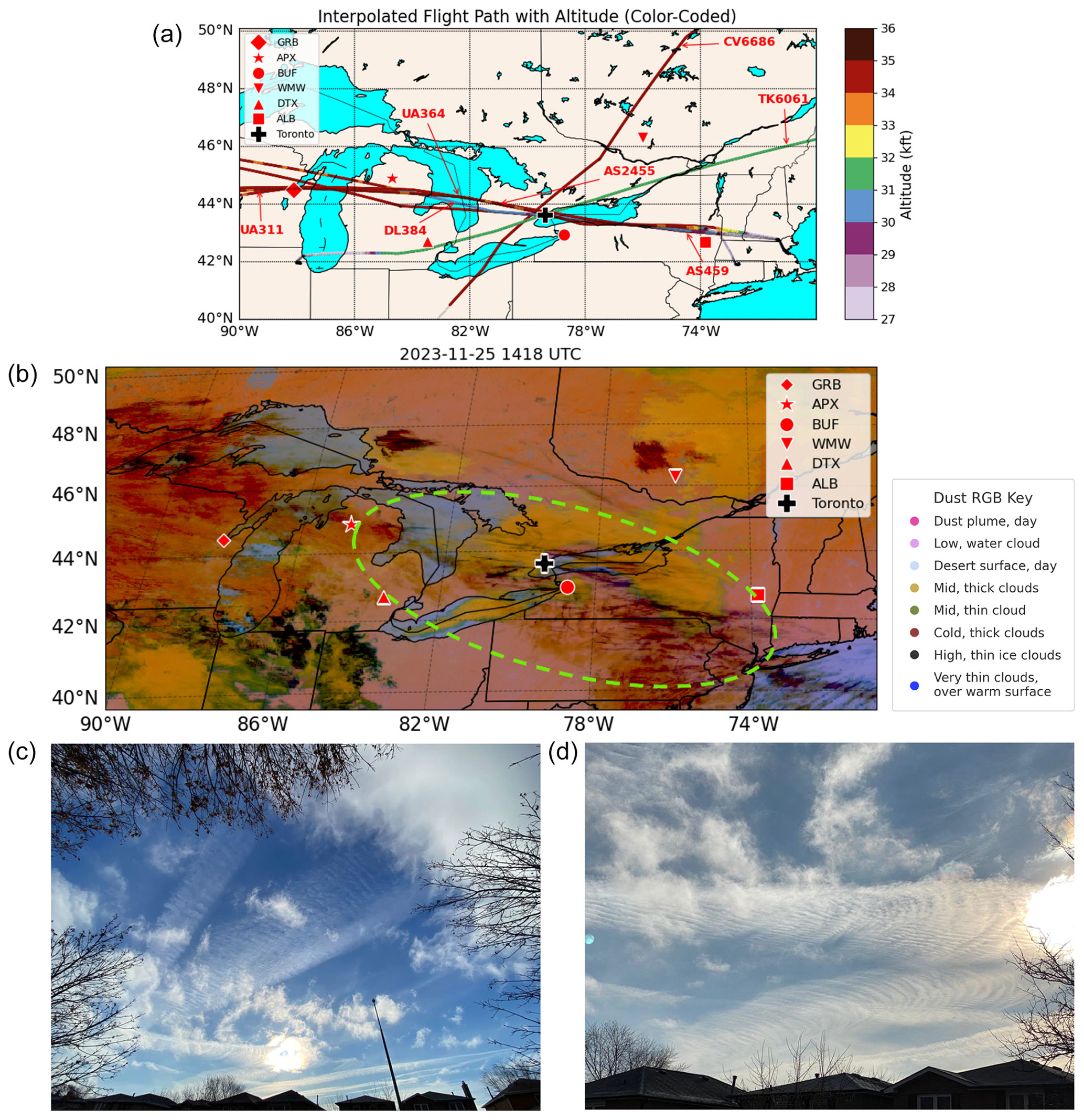 Figure 1(a) Interpolated flight paths and sounding stations (b) GOES-16 Dust RGB and sounding stations at 14:18 UTC (c) and (d) photos taken from Toronto, Canada at 14:20 UTC by Alexei Korolev. The names of the abbreviated sounding stations (red markers) can be found in Table 1. (b) The green dashed ellipse highlights a region where both natural cirrus and distinct linear contrails are observed.