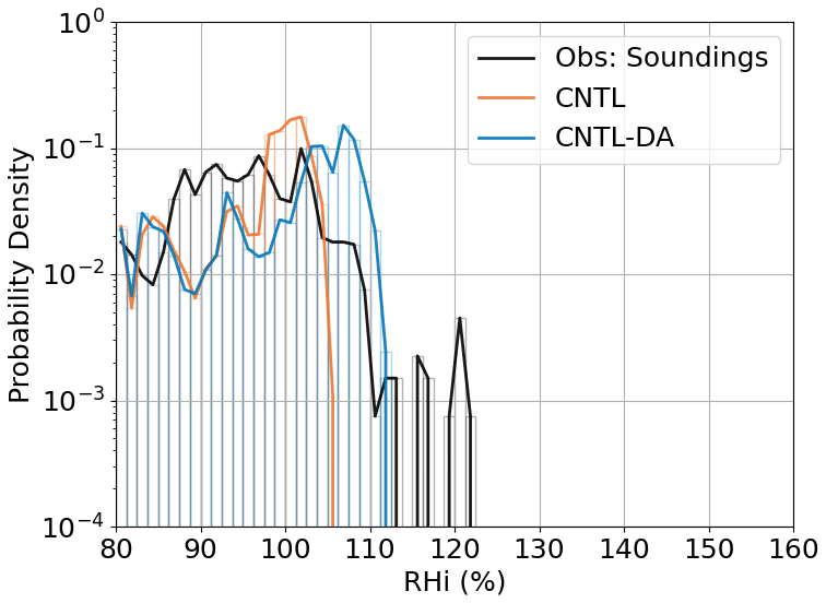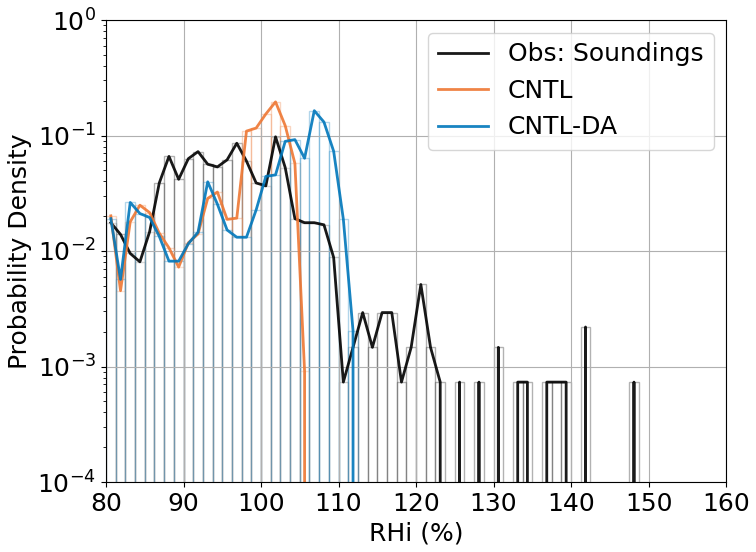 Figure 2RHi distribution for CNTL, CNTL-DA simulations at 12:00 UTC. The observations from all the radiosonde sounding is combined and shown as “Obs: Soundings” (black line). The GEM soundings include data in a 5 km × 5 km domain around the location of the balloon to account for uncertainty. All the data is limited for pressure levels between 100 and 600 hPa and temperatures lower than −38 °C.