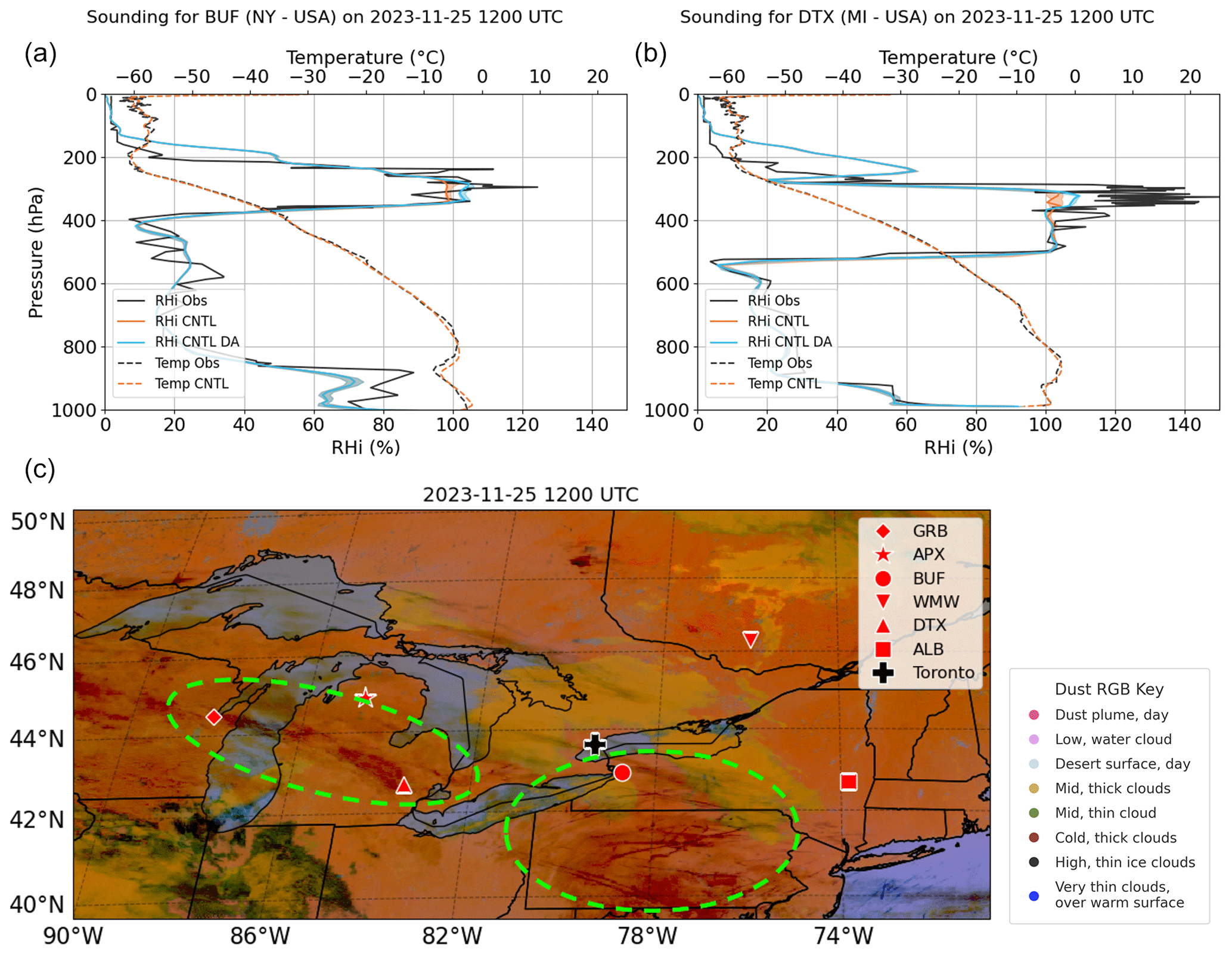 Figure 3Soundings for (a) White Lake (DTX), (b) Buffalo (BUF) compared to the CNTL and CNTL-DA simulations. The shaded areas are the minimum and maximum values for a 5 km × 5 km domain around the location of the balloon. Panel (c) is the GOES-16 Dust RGB at 12:00 UTC. The green dashed regions highlight extensive layers of natural cirrus clouds over the Great Lakes and Northeastern United States, which serve as a visual proxy for widespread ice-supersaturated regions. South of BUF, distinct linear features indicate the development of contrails. The names of the abbreviated sounding stations (red markers) can be found in Table 1.