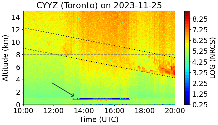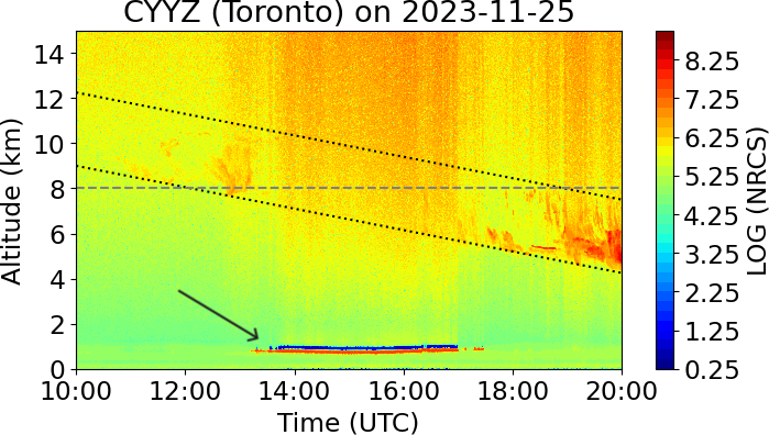 Figure 4Time series of ceilometer's normalized range corrected signal (NRCS). The backscatter profiles are for 25 November 2023 at Pearson International Airport (CYYZ) in Toronto. The dotted lines indicate the descending cloud bottom and cloud top over time. The dashed line shows the altitude of the cloud bottom at 12:00 UTC. The arrow indicates the low-level stratus between 13:00 and 17:00 UTC.
