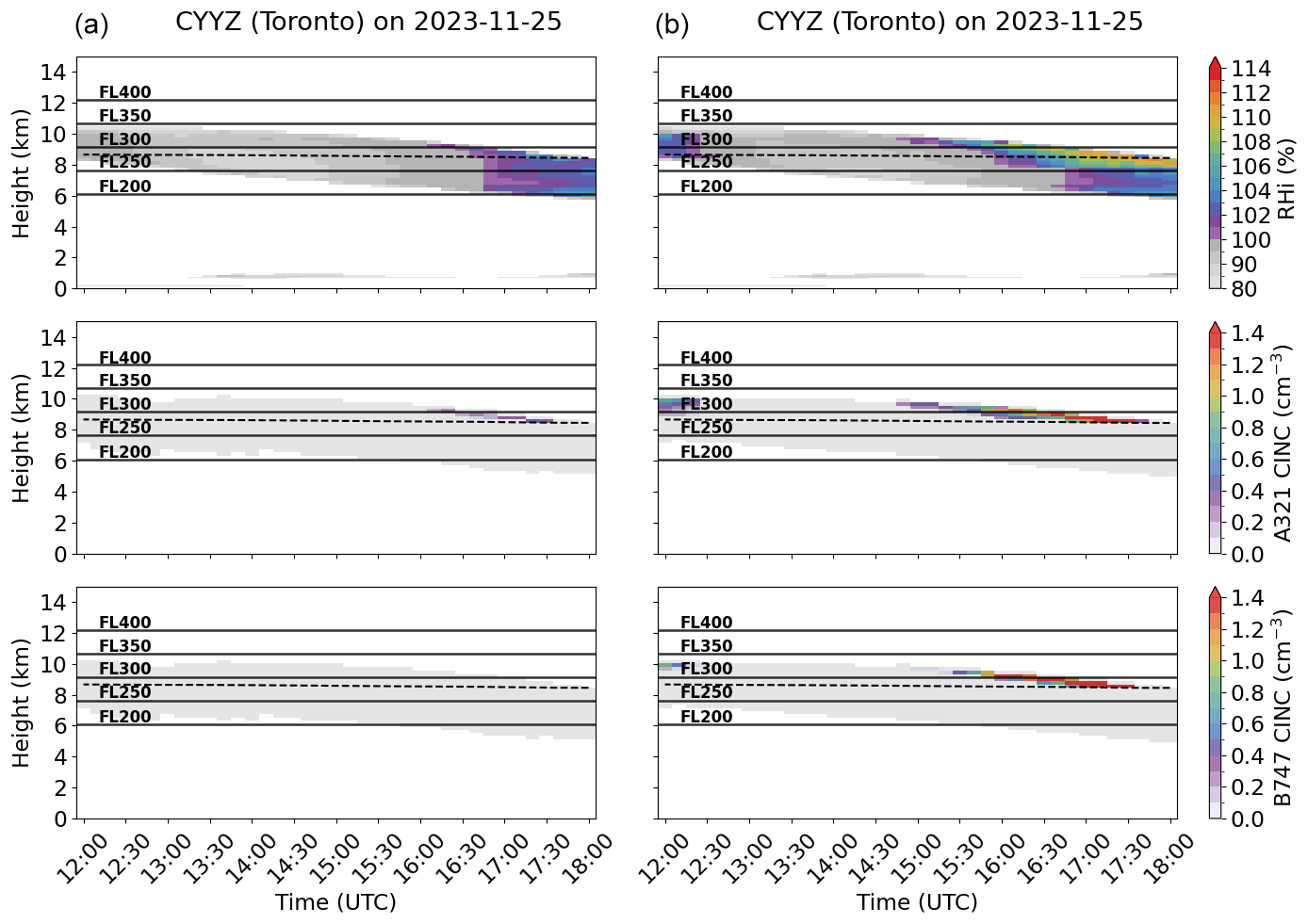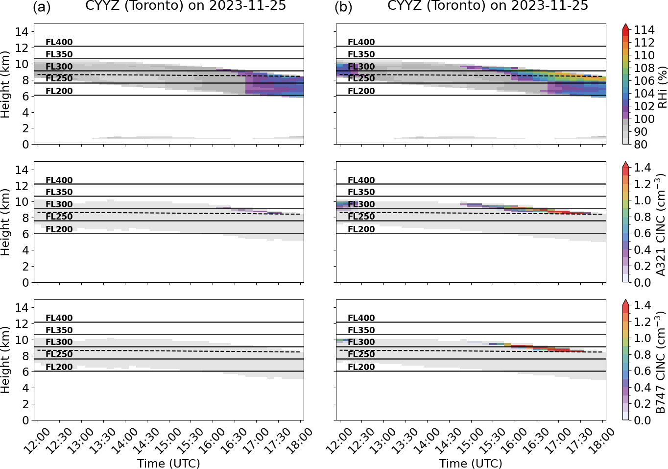 In the Great Lakes region, the interaction between cold Arctic air masses and the relatively warmer lake waters frequently triggers lake-effect snow events (Niziol et al., 1995). The synoptic conditions on 25 November 2023 and the following days facilitated such phenomena, leading to the formation of low clouds and heavy snowfall in the surrounding areas. On this day, these low clouds significantly attenuated the ceilometer signal at CYYZ, Toronto, making it nearly impossible to retrieve data from cirrus clouds between 13:00 and 17:00 UTC (Fig. 4). However, a descending high cloud base was still noticeable, aligning with the descending moist layer observed in the CNTL and CNTL-DA simulations (Fig. 5a and b, top panels). The CNTL and CNTL-DA simulations show three panels each of time-height vertical profiles of RHi and the corresponding CINC for A321 (middle panels) and B747 aircraft (bottom panels). Between 11:00 and 12:00 UTC, the ceilometer’s backscatter intensity displayed a diffused structure, indicative of thin ice clouds like cirrus or contrails ∼10 km in altitude (Fig. 4). By 12:00 to 13:00 UTC, the cirrus clouds became more structured, with a lower cloud base near 8 km, suggesting the presence of ice-supersaturated regions.