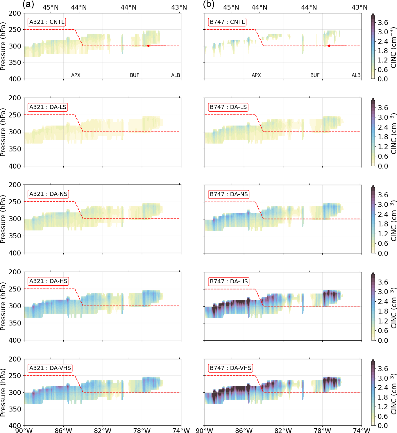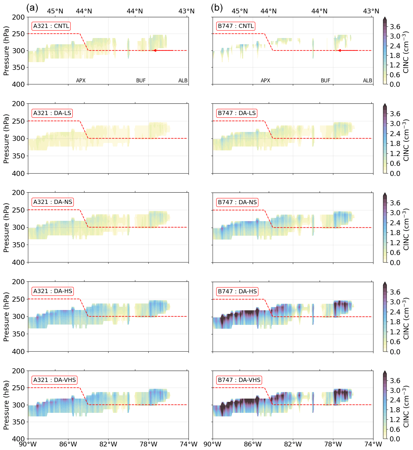 Figure 6Vertical cross-section along the flight corridor (Albany–Buffalo–Gaylord; ALB–BUF–APX) indicated by the red dashes and red arrow for (a) an A321 and (b) a B747. The first panel in (a) and (b) is the CNTL simulation. The emission index categories (from the second to bottom panel) shown for (a) and (b) is Low-Soot (LS), Normal-Soot (NS), High-Soot (HS) and Very-High-Soot (VHS) using the deposition adjusted (DA) configuration. The flight paths are overlaid on regions depicting the contrail ice number concentration (CINC) at 13:00 UTC.