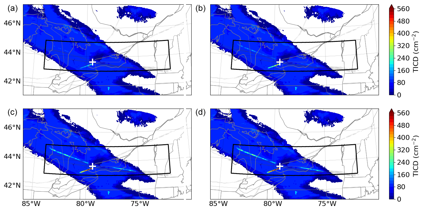 To quantify contrail persistence and its influence on cirrus cloud properties, we identify and track the regions associated with the persistent contrails over Toronto on 25 November 2023 (Fig. 1). This region spans 310 to 290 hPa, where RHi≥100 %, and corresponds to the layer in which two flights (DL384 and TK6061) generated contrails. The DA-VHS simulation, which produce the longest-lived contrail, is used to define this region. We calculate the 99.5th percentile of the total ice column density (TICD) from the DA-VHS simulation (described in the next section), which provides the strongest and most coherent contrail signal, and use it to construct a binary mask defined as