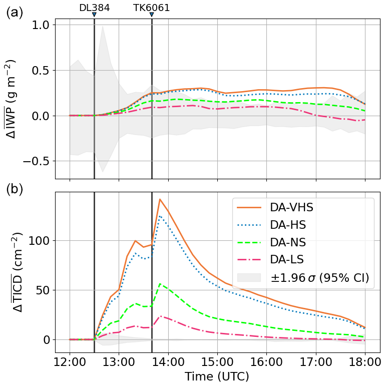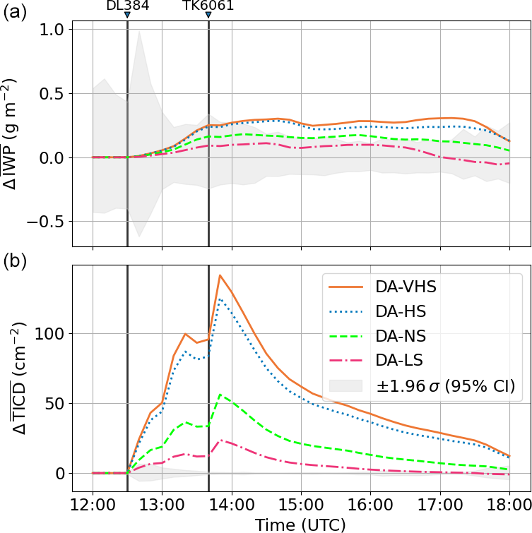 After 14:45 UTC, the CNTL simulation remains mostly ice-subsaturated to only weakly ice-supersaturated (maximum RHi≈104 %), supporting only a shallow layer with a CINC of ∼0.4 cm−3 for an A321 aircraft. In contrast, the CNTL-DA simulation develops a pronounced ice-supersaturated region (RHi up to 112 %) conducive to persistent contrail formation near 10 km. Under these conditions, contrails from the A321 appear first at RHi≥100 %, followed by those from the B747 around 15:15 UTC as RHi rises to ≈102 %. The CNTL-DA simulation produced deeper contrail forming region with enhanced CINC up to 1.4 cm−3 for both aircraft types compared to the CNTL simulation.