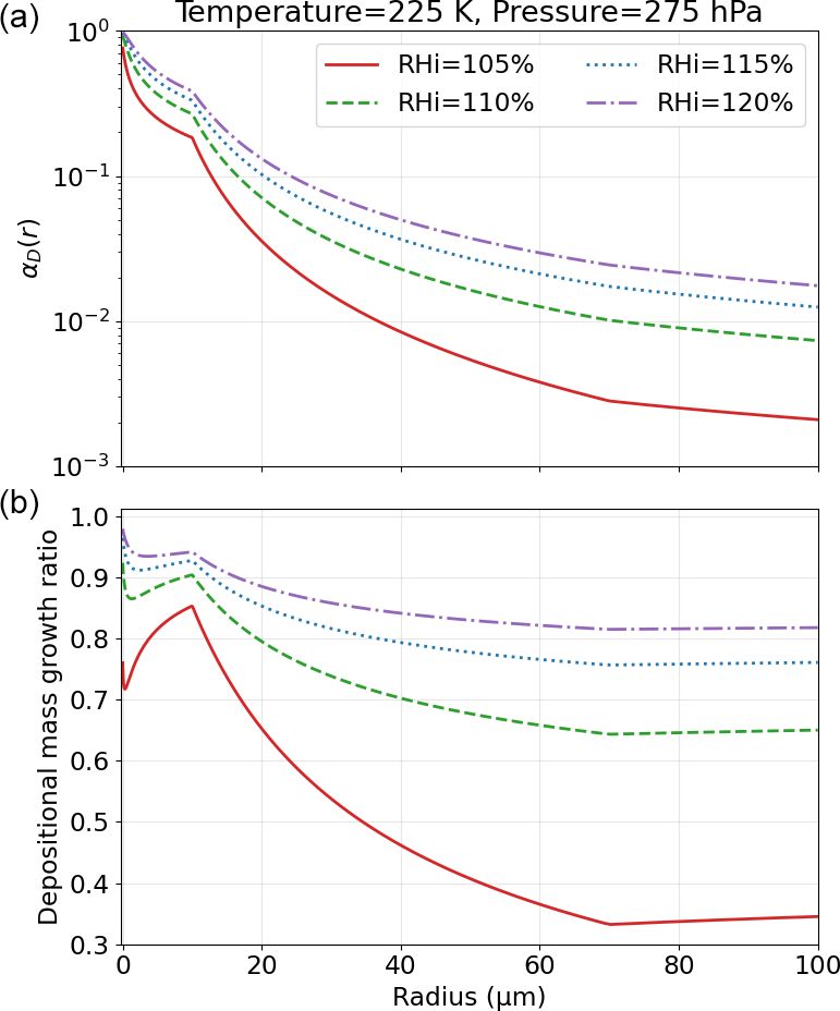 In P3, the growth of ice particles follows the same formulation as in Eq. (A1), but instead of using , the uncorrected diffusivity is used Dv, which is a function of temperature T and pressure p (Hall and Pruppacher, 1976). Consequently, we do not have an explicit description for αD that can be directly modified to determine the depositional growth rate in P3.
