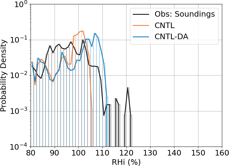 Excluding the White Lake (DTX) station from the analysis yields a closer agreement between the CNTL and CNTL-DA simulations and the observational distribution. This discrepancy arises not from deficiencies in the sounding data, but from GEM’s limited ability to represent the extreme ice-supersaturated conditions frequently observed over DTX.