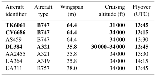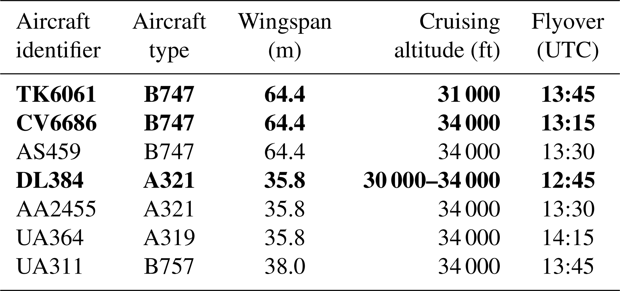 Selected Flights: a subset of flights was identified as potential contributors to contrail formation (Fig. 1a and Table 2). These flights cruised at altitudes ranging from 8800 to 10 700 m (29 000 to 35 000 ft).