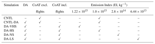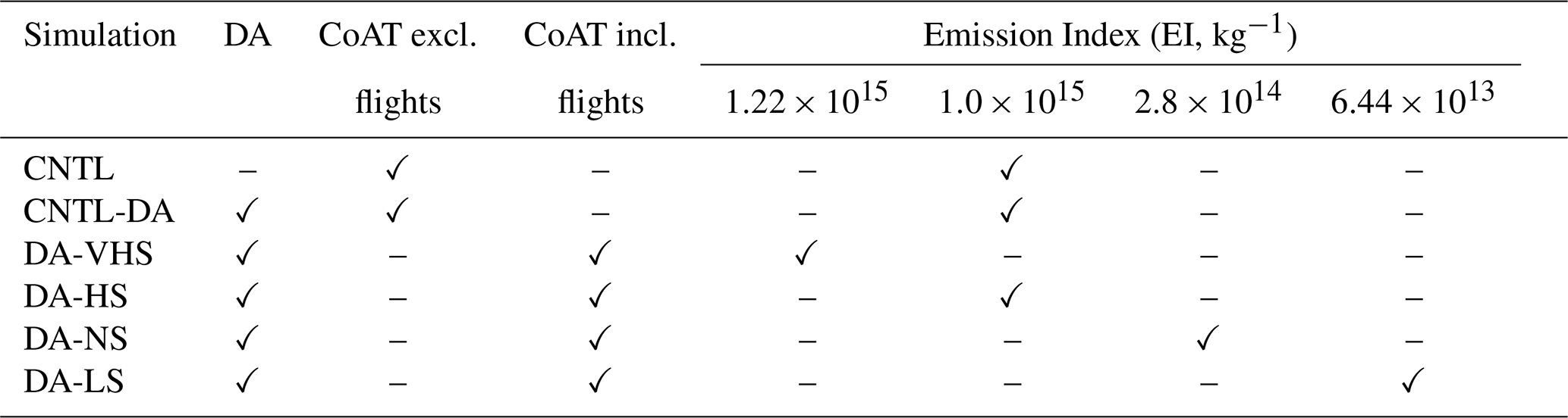 Table 3Summary of GEM simulations showing the use of deposition adjustment (DA), inclusion of FlightRadar24 tracks (CoAT incl./excl. flights), and emission index (EI) category for each soot regime (Very-High-Soot (VHS), High-Soot (HS), Normal-Soot (NS), Low-Soot (LS)). A checkmark denotes applicable configurations.