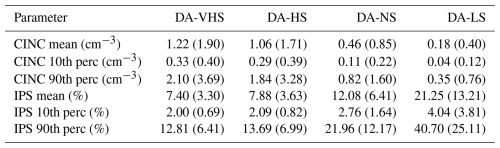In the DA simulations, with enhanced RHi, the regions of persistent contrail formation become more consistent across aircraft and EI categories, and the main differences emerge in the CINC and IPS statistics. For example, in the DA-VHS simulation, the A321 produces a mean CINC of 1.22 cm−3 with a mean IPS of 7.4 %, whereas the B747 yields a higher mean CINC of 1.90 cm−3 but a lower IPS of 6.41 % (Table 4).