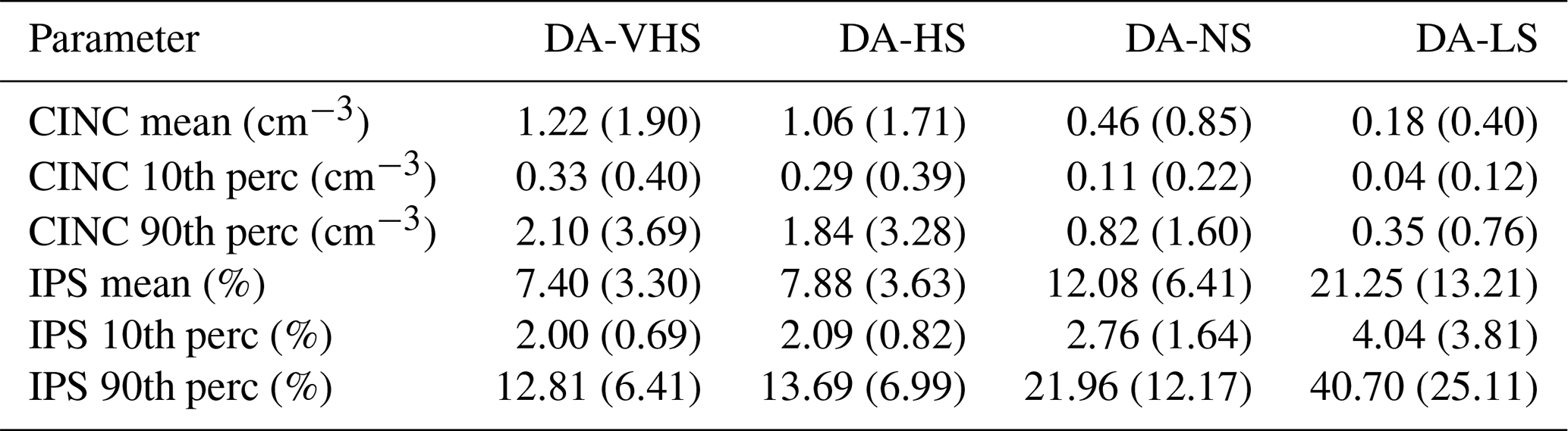 Table 4A321 and B747 (in parentheses) Contrail Ice Number Concentration (CINC) and Ice Particle Survival (IPS) statistics (mean, 10th, and 90th percentiles) for young contrails (5 min) across emission indices (EI) for the flight corridor in Fig. 6. The EI categories are Very-High-Soot (VHS: 1.22×1015 kg−1), High-Soot (HS: 1.0×1015 kg−1), Normal-Soot (NS: 2.8×1014 kg−1), and Low-Soot (LS: 6.44×1013 kg−1).