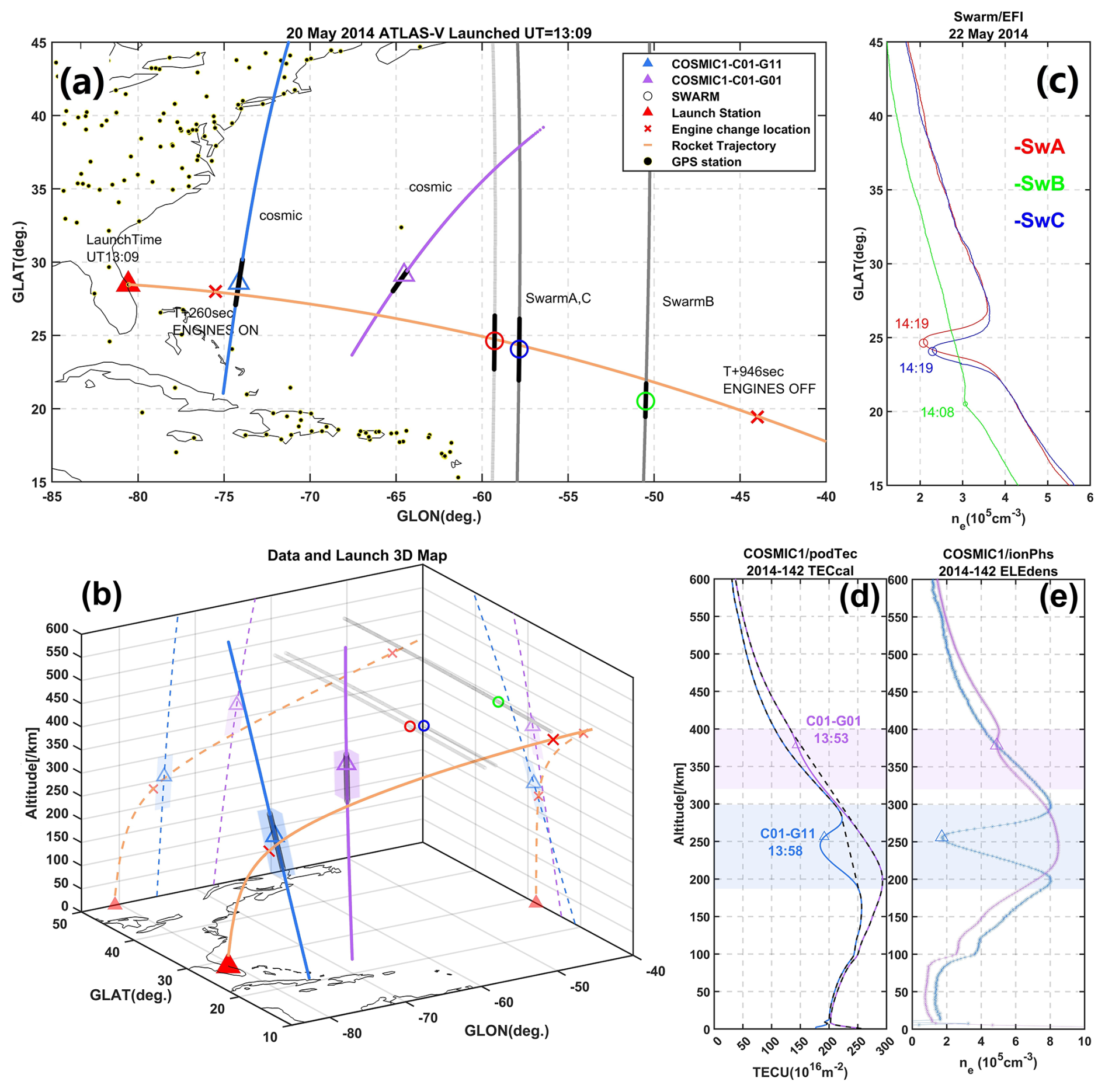 Figure 1Observation Data Distribution and Details. (a) Map of rocket launch data distribution: the orange line represents the rocket trajectory, the red triangle marks the launch site, the red “×” indicates the start and end points of the rocket's second-stage engine working; The projection of COSMIC observation location points are shown as blue and purple lines, with triangular markers indicating detected depletion locations. The red/green/blue symbols represent REDs center observed by Swarm-Alpha/Bravo/Charlie, the gray dashed lines their trajectories. (b) 3D rocket trajectory (geographic projections) with COSMIC puncture-line shading indicating depletion extents. (c) Electron density measurements from Swarm satellites, with UT time at each marked point. (d) COSMIC TEC profile, with shaded REDs region and corresponding UT time. (e) COSMIC electron density profile.