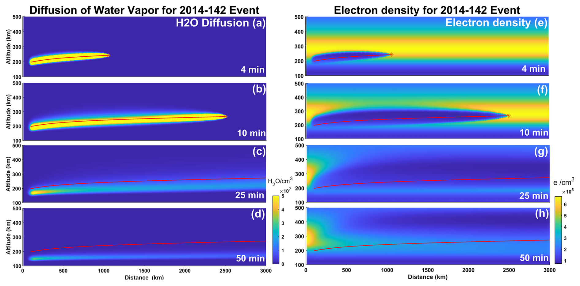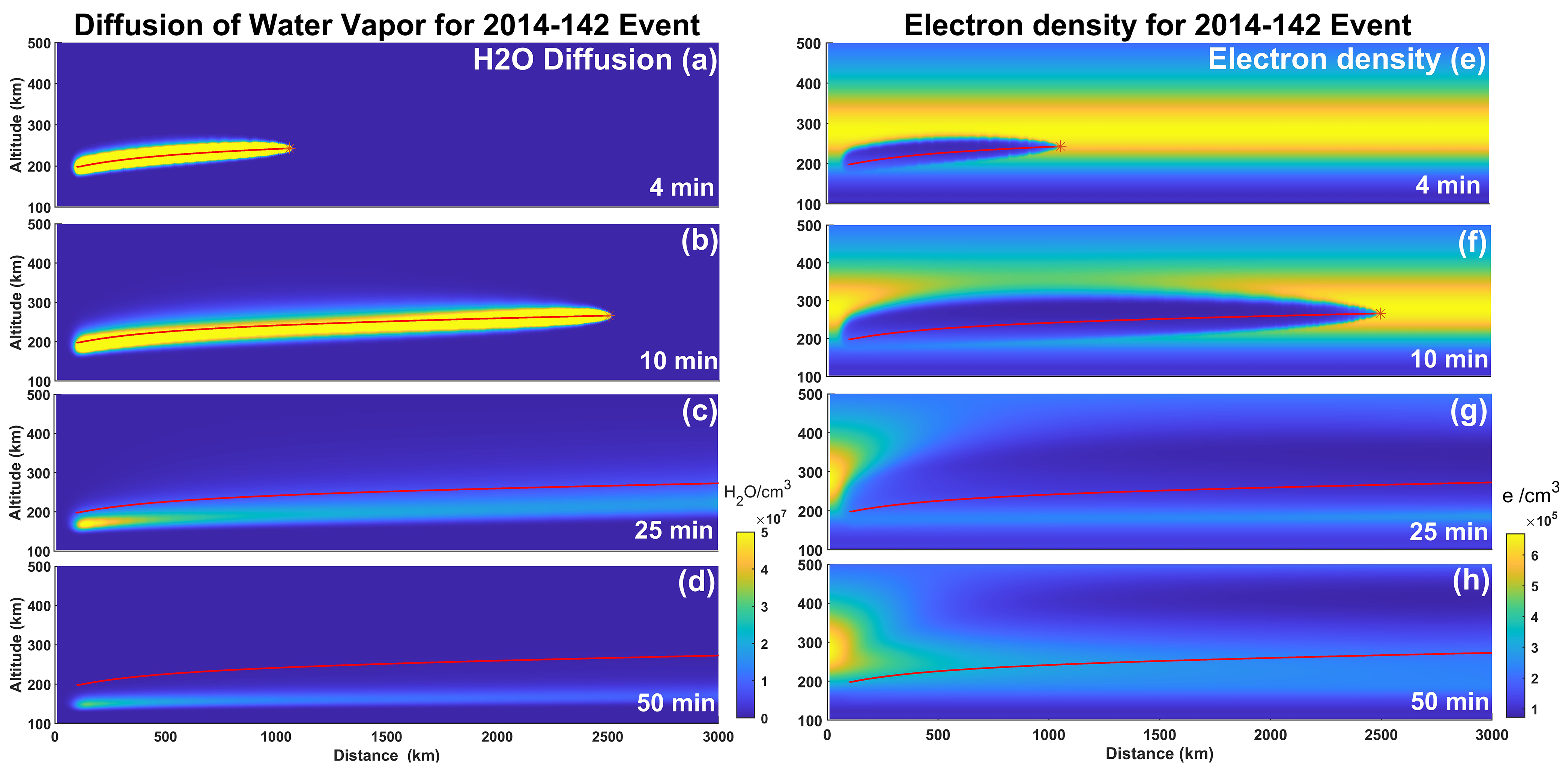 Figure 3Simulation molecular density distribution of H2O and electrons. (a–d) H2O molecular density distribution along the rocket trajectory (height vs. flight distance). (e–h) Electron density distributions along the rocket trajectory. (a–h) Time (lower-right corners): minutes after second-stage ignition; red line is rocket trajectory; red star is current release position.