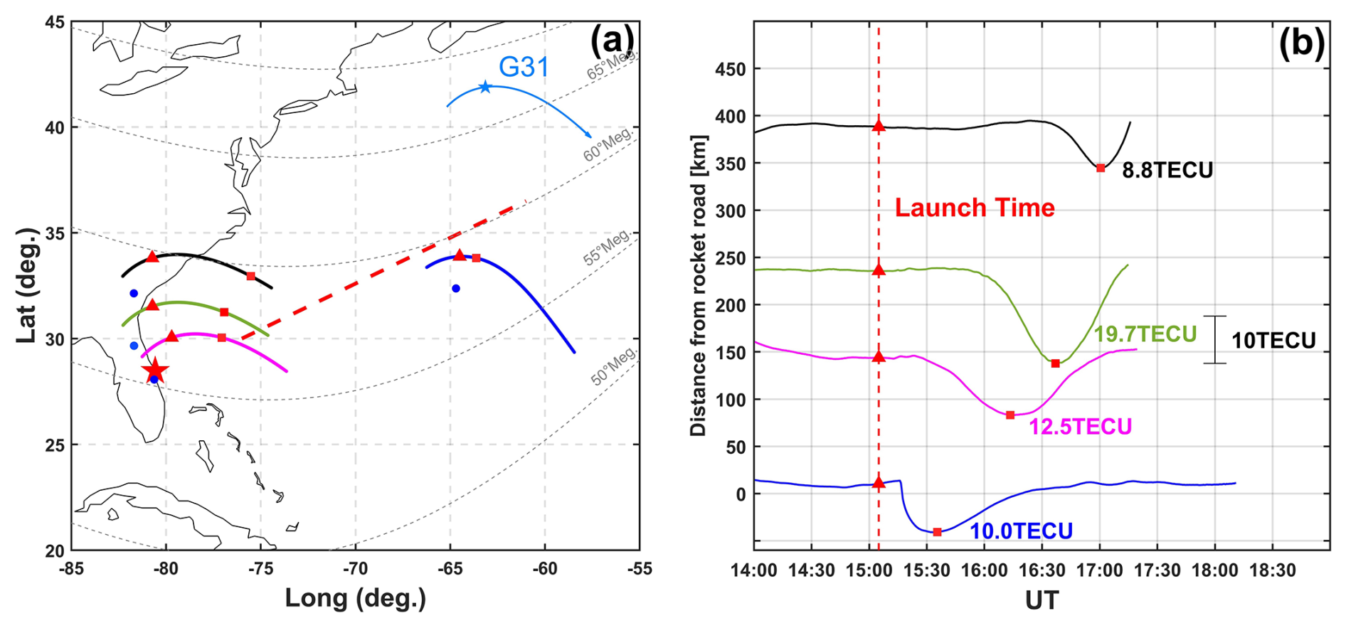 Figure 5TEC signals of the depletion observed within the REDs at several different time intervals. (a) Map of piercing points: red triangles indicate the positions of piercing points at the rocket launch time; small red squares mark the positions where the maximum TEC values of the REDs were recorded; blue circles represent GPS stations; red pentagrams indicate the rocket launch site; red dashed lines show the central line of the REDs. (b) Extracted TEC profiles of the depletion: red dashed lines denote the rocket launch time; red triangles and squares in different shades correspond to the elements shown in the left panel.